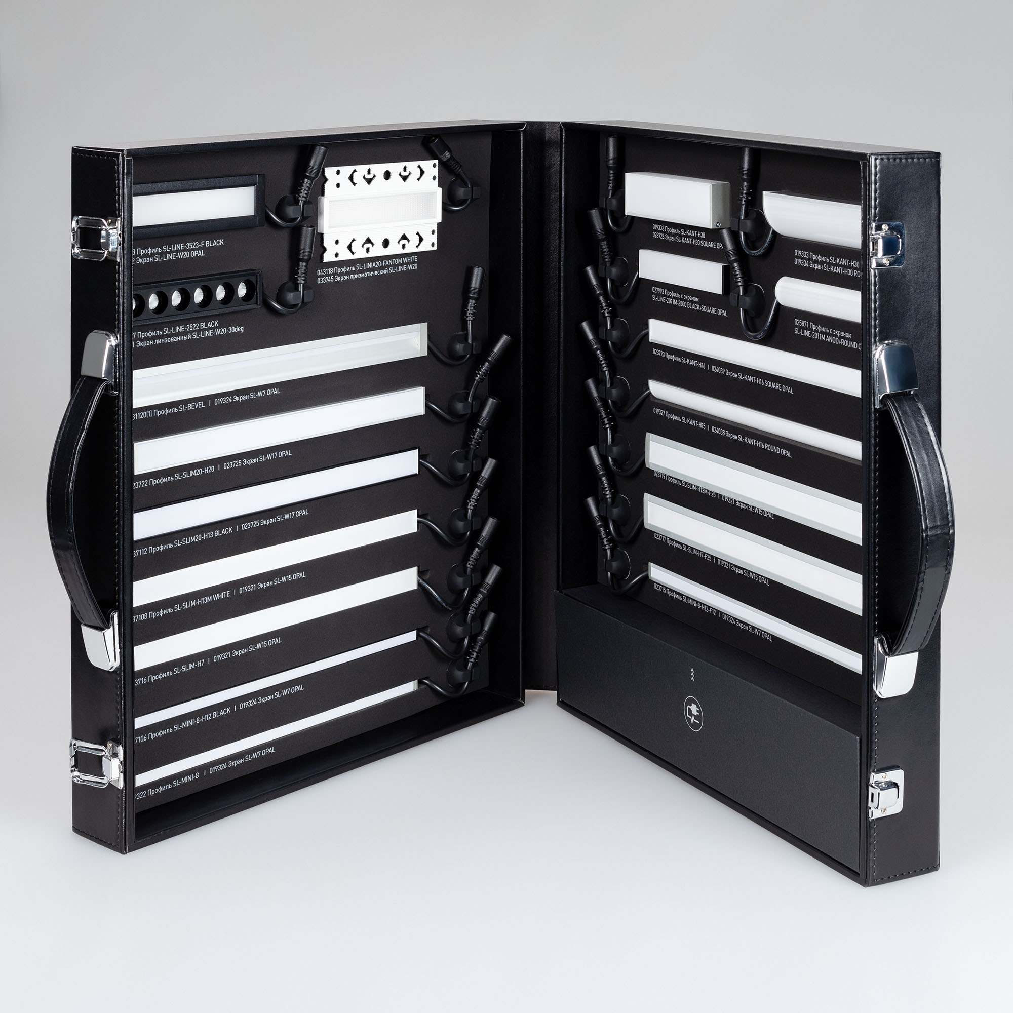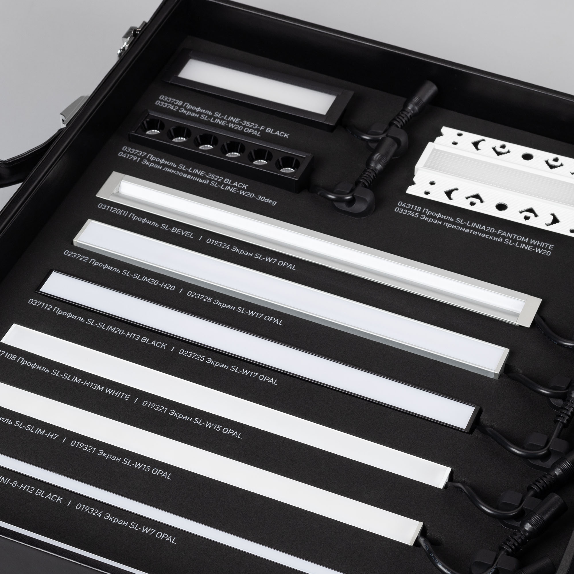 Демонстрационный набор обновлённых профилей серий SL-LINE-2011, SL-KANT-H16/H30, SL-SLIM/SLIM20, SL-MINI-8. Включает отрезки профиля с экраном и заглушками по 20см со светодиодной лентой 24В. Также в комплекте блок питания.