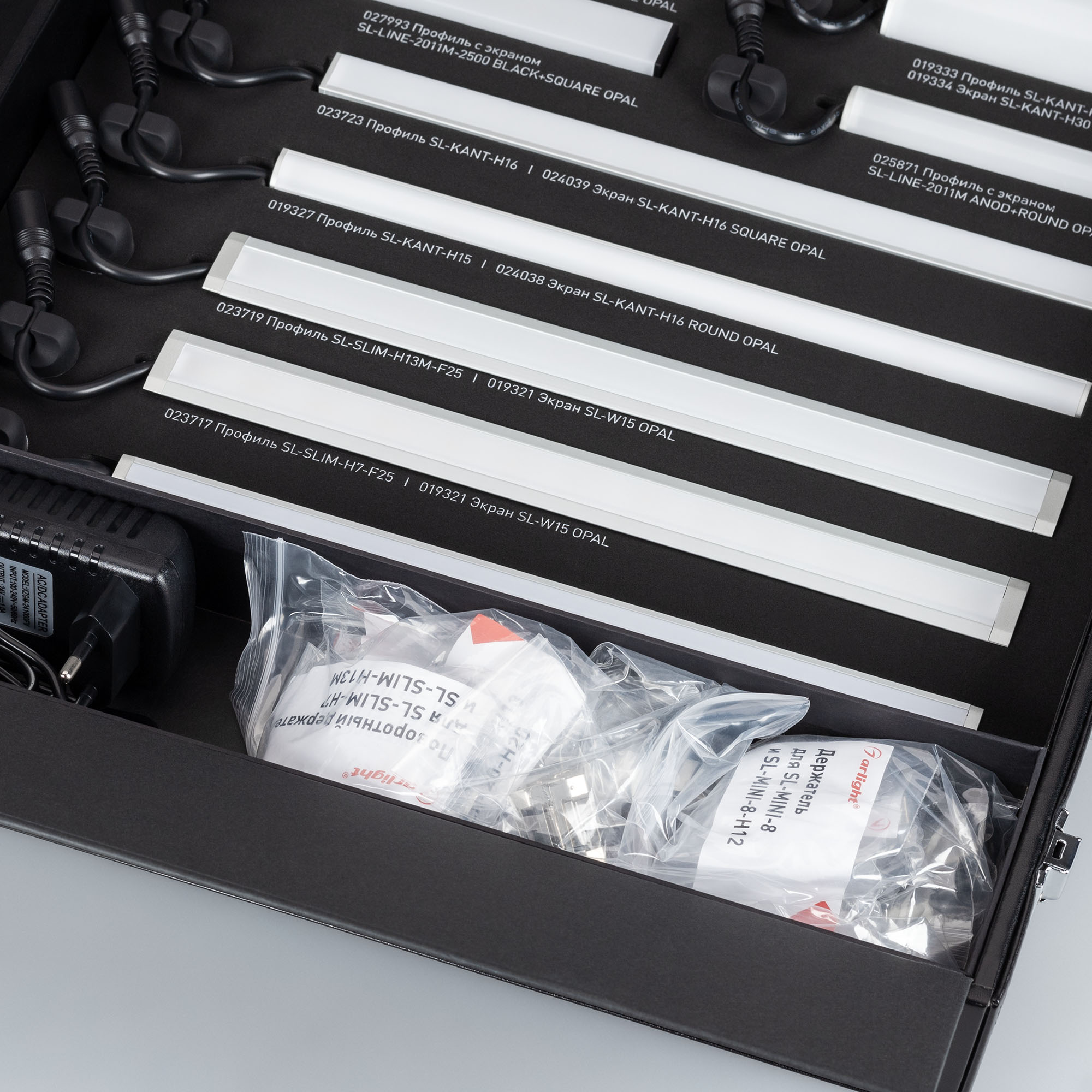 Демонстрационный набор образцов профиля SL-LINE-2011, SL-KANT-H16/H30, SL-SLIM/SLIM20, SL-MINI-8 в комплекте с экранами, светодиодной лентой напряжением 24В, заглушками, держателями. В комплекте идет блок питания для демонстрационного подключения.