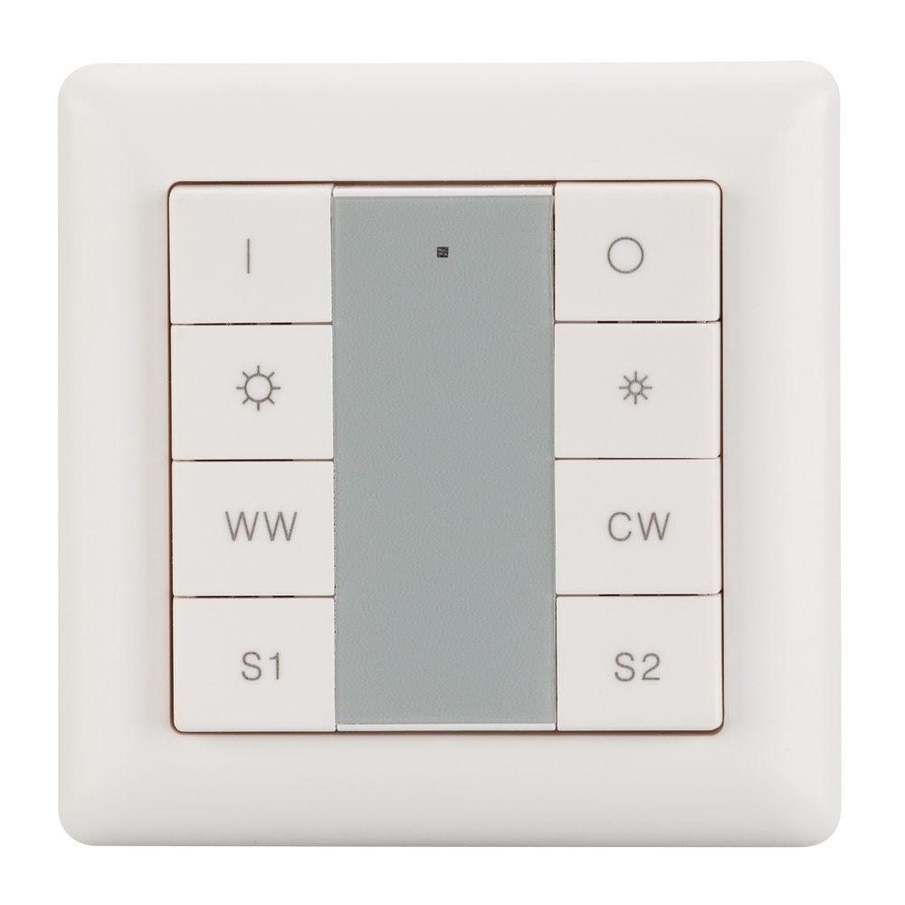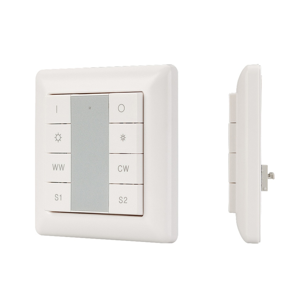 Настенная накладная пластиковая панель белого цвета с кнопочным управлением (8 кнопок управления) для светодиодных MIX-лент. 1 зона управления, 2 слота памяти пользовательских настроект. Питание по шине DALI. Система команд DT8, до 64 устройств при адресации 4 каналов (2CW+2WW) на 1 адрес.