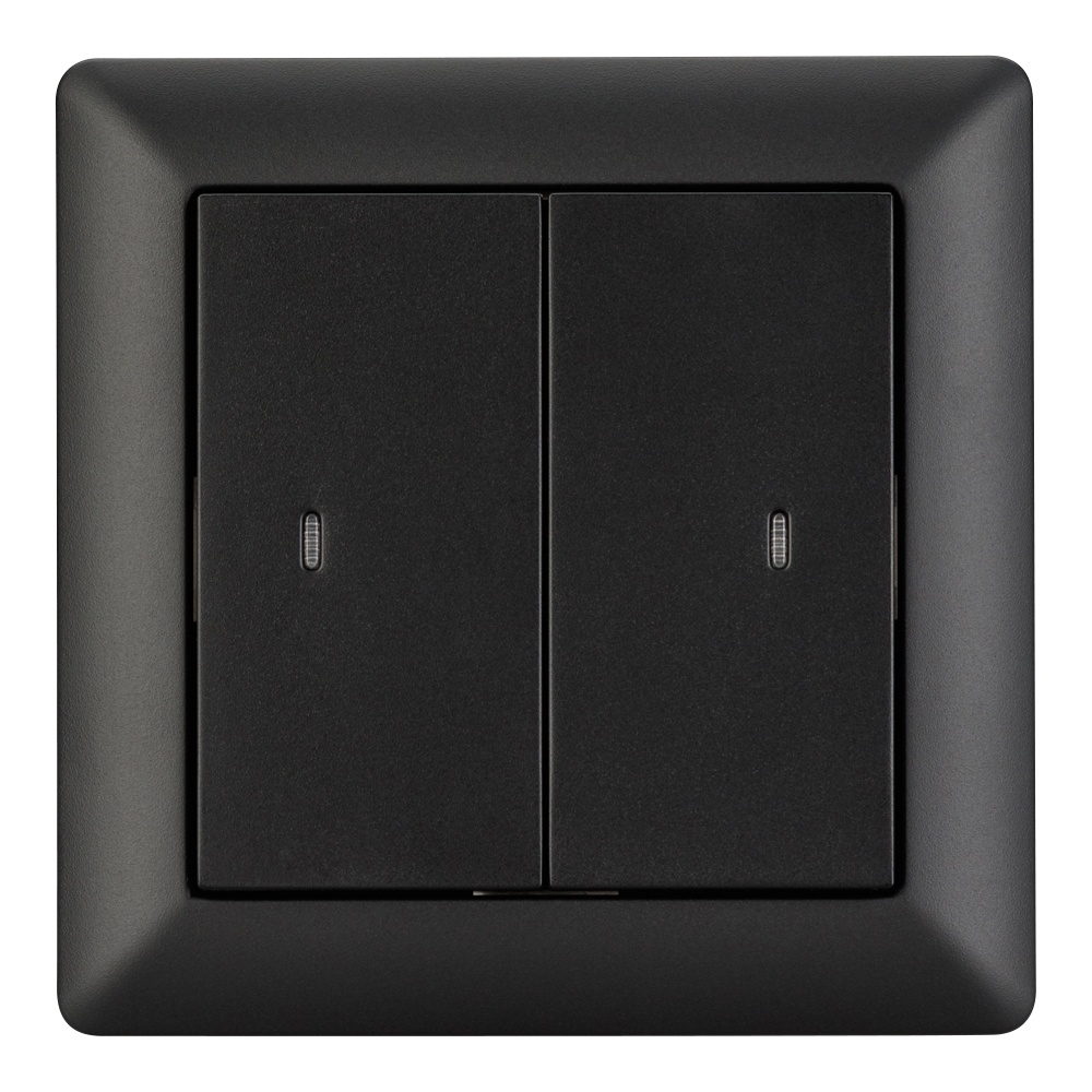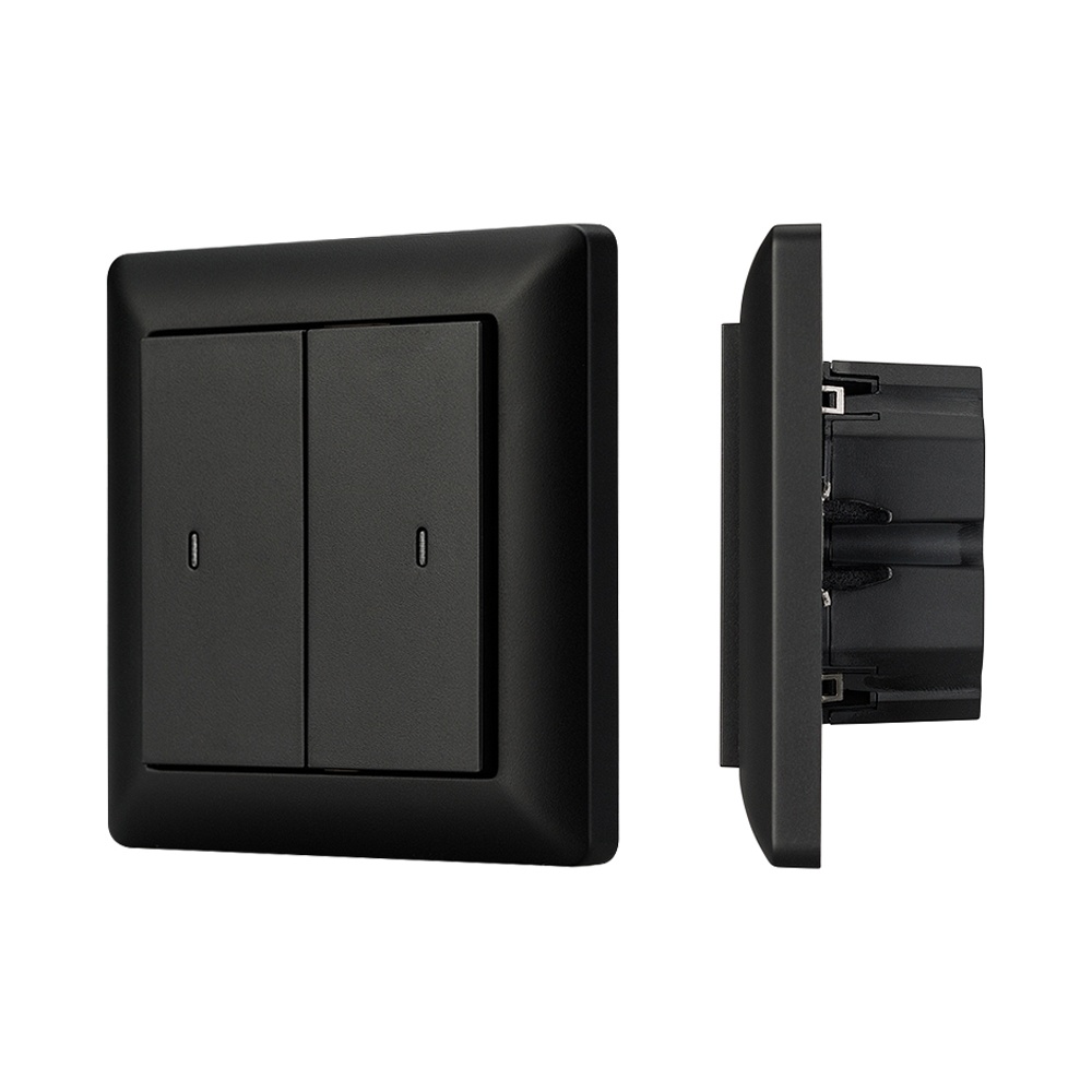 Универсальная двухклавишная встраиваемая настенная панель стандарта KNX с четырьмя кнопками. Цвет корпуса графит. Питание от шины KNX DC 21-30V. Размер 86х86х45 мм.