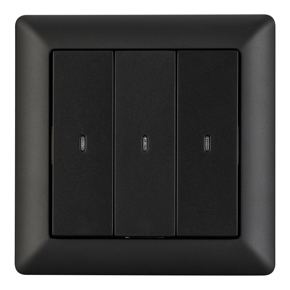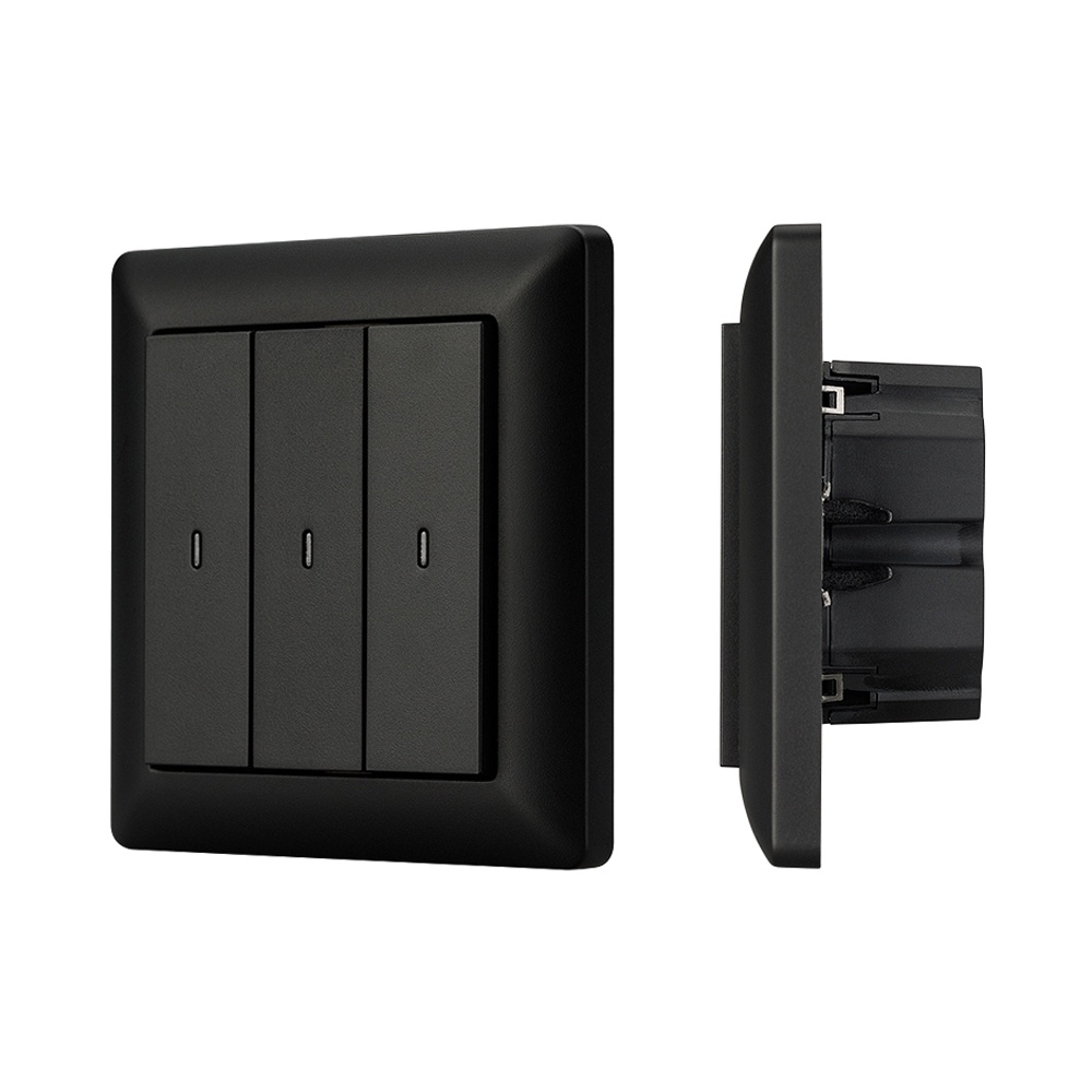 Универсальная трёхклавишная встраиваемая настенная панель стандарта KNX с шестью кнопками. Цвет корпуса графит. Питание от шины KNX DC 21-30V. Размер 86х86х45 мм.