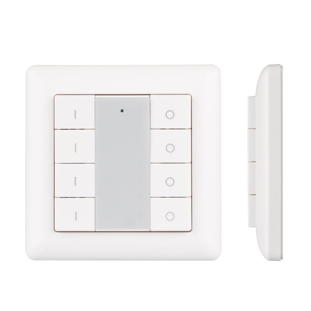 Накладная пластиковая панель белого цвета с кнопочным управлением, предназначенная для включения и выключения световых сцен в системах управления светом KNX. Позволяет осуществлять включение/выключение, диммирование, управление шторами и жалюзи, управлять сценами. Поддерживает управление с помощью 8 настраиваемых кнопок. Устройство совместимо с исполнительными устройствами стандарта KNX, в том числе, мировых производителей ABB, SCHNEIDER ELECTRIC, SIEMENS, ZENNIO и другими. Удобное и точное управление при помощи отдельных механических кнопок для каждой функции. Питание от шины KNX. Габариты устройства составляют 86х86х15 мм, установка в стандартную монтажную коробку. Пластиковый корпус, цвет белый. Стандартная рамка входит в комплект поставки.