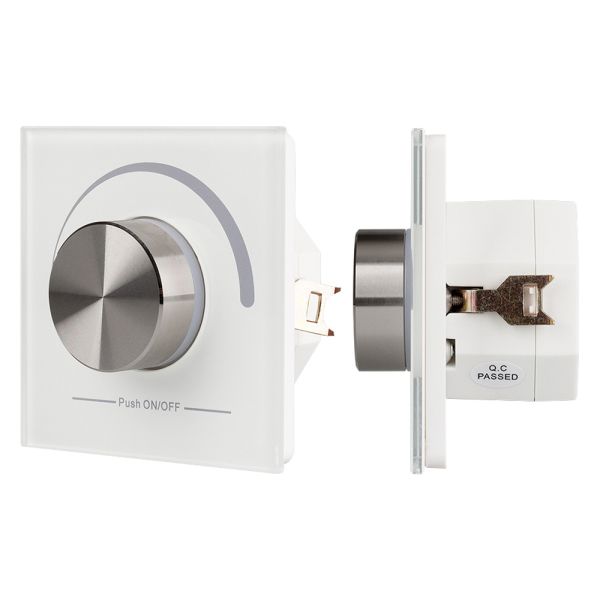 Встраиваемая роторная панель белого цвета для управления диммерами серий SR, Excellent. Позволяет осуществлять включение/выключение источников света, реуглировку их яркости. Питание панели осуществляется от 230В. Габариты составляют 86х86х45 мм, корпус белого цвета, лицевая часть рамки панели - стекло.