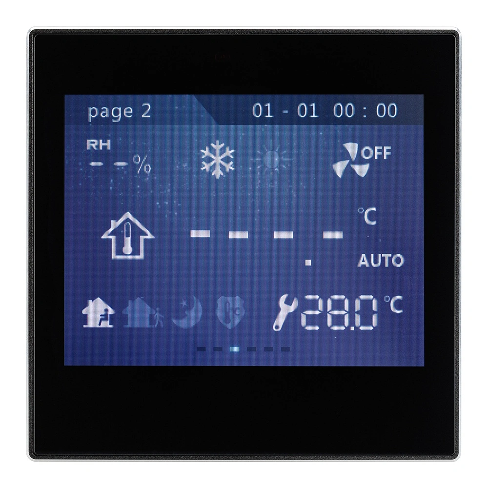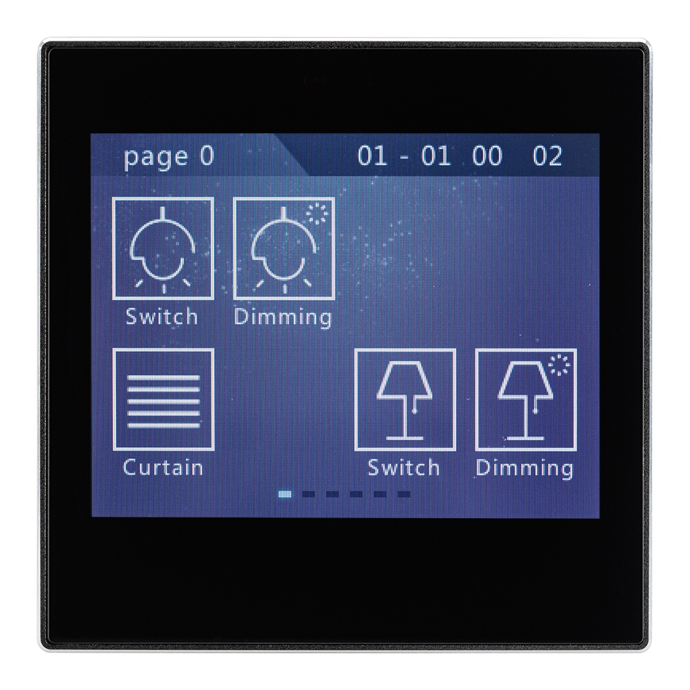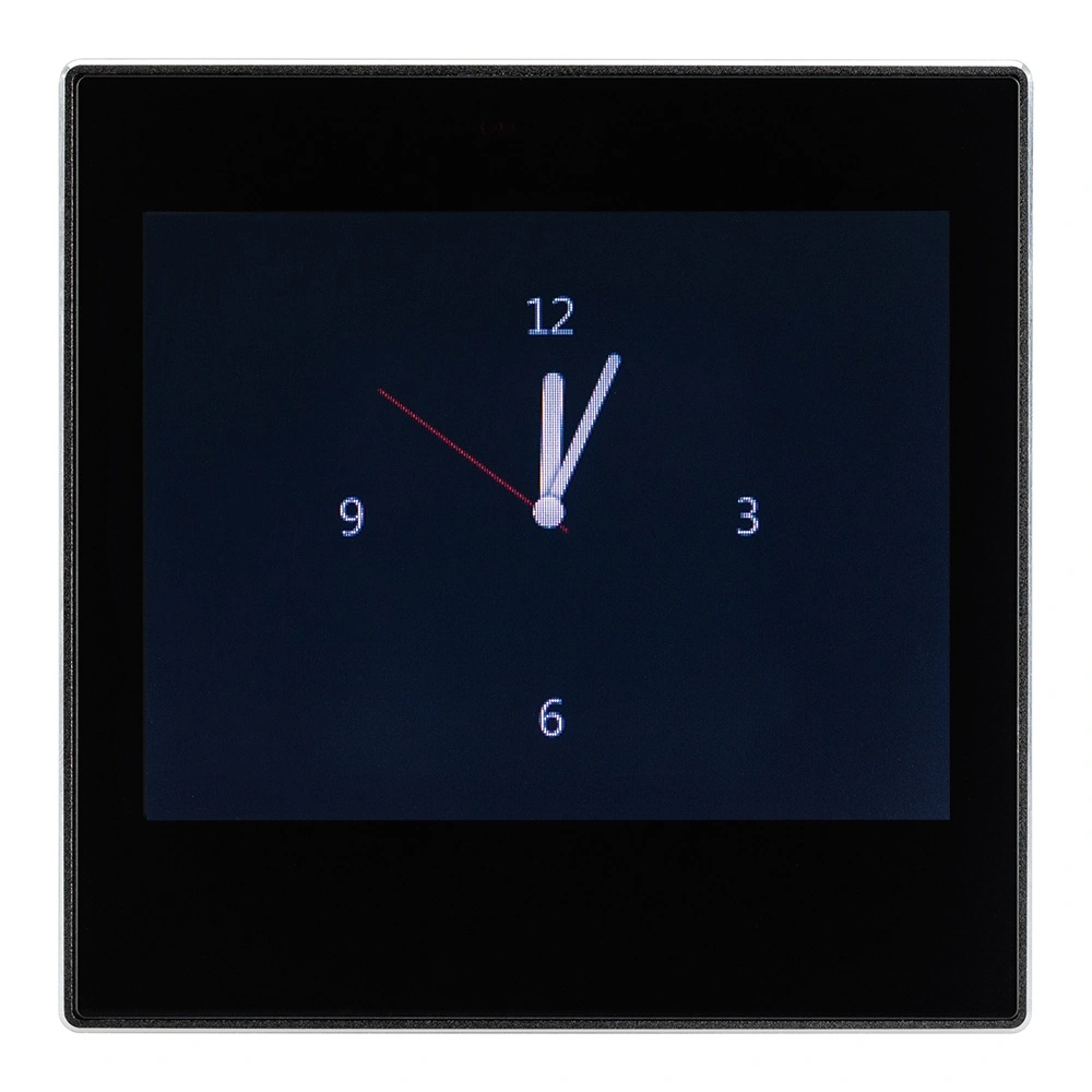 Многофункциональная встраиваемая настенная панель стандарта KNX с цветным сенсорным дисплеем 3,5”. Требуется дополнительное питание AUX DC 21-30V. Размер 86x86x23.5 мм.