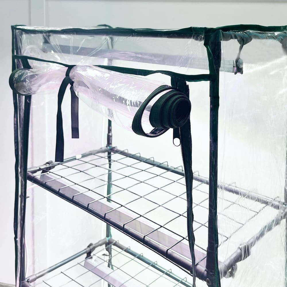 Прозрачный чехол из пленки не препятствует фотосинтезу и помогает сохранить нужную влажность и температуру воздуха внутри. Переднее полотно чехла откидывается и держится на завязках для проветривания и ухода за рассадой.