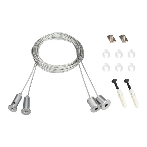 Подвес для профилей SL-LINE, S2-LINE, SL-ARC. Цвет - серебристый. В комплекте: трос 4 м - 2 шт., (винт с площадкой 9х15х2мм), шуруп с дюбелем - 2 шт. Максимальная нагрузка на 1 трос 17,5 кг. Цена за комплект.