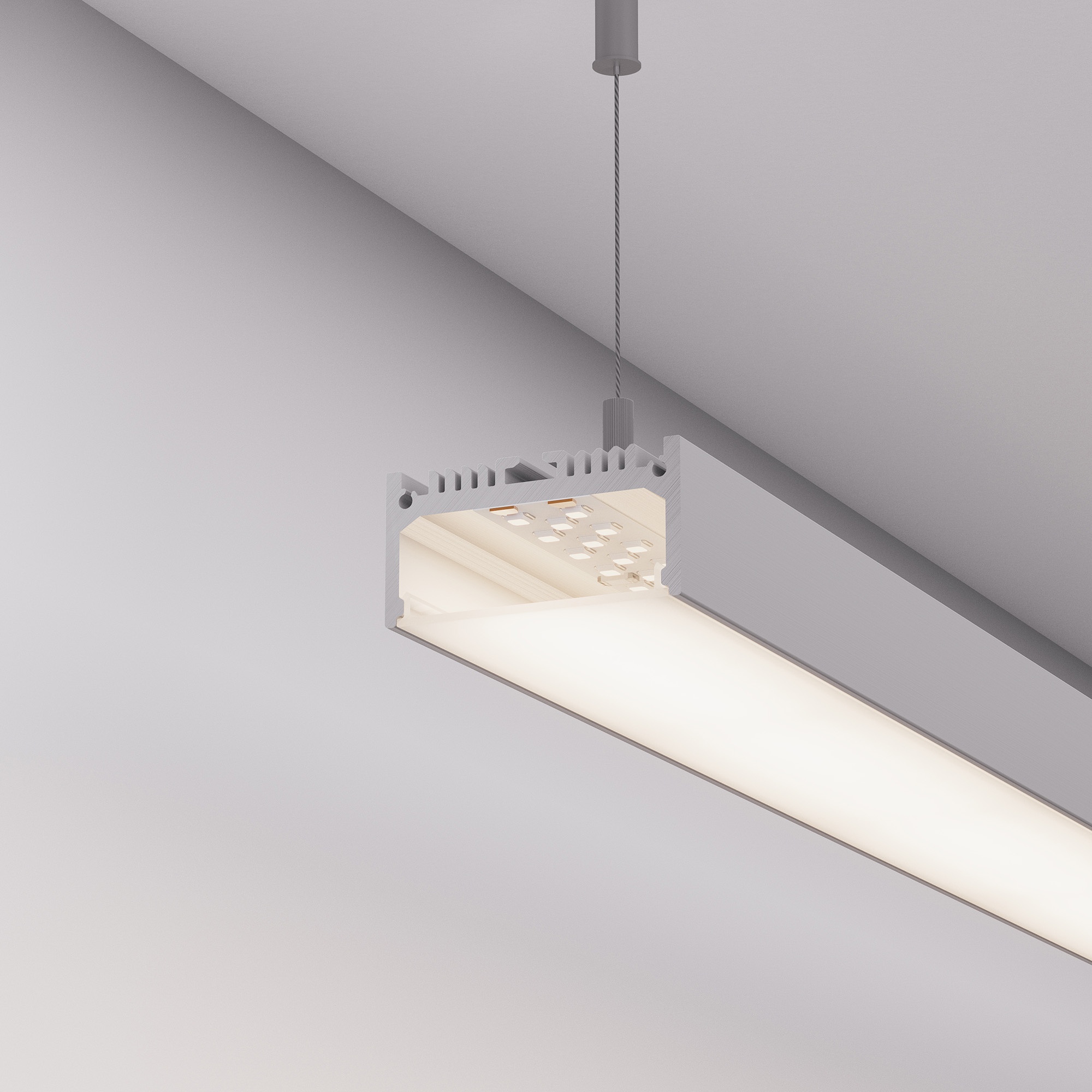 Подвесной профиль из анодированного алюминия для контурной подсветки элементов интерьера. Габаритные размеры профиля составляют 2000 мм в длину, 48 мм в ширину и 24 мм в высоту. Площадка для установки светодиодных лент позволяет использовать ленту шириной до 35 мм и мощностью до 37 Вт/м. Это обеспечивает гибкость в выборе светодиодных лент и создает потрясающие световые решения. Экраны, заглушки и другие аксессуары не включены в комплект и приобретаются отдельно. Цена указана за 1 метр профиля. Отличное решение для создания современных световых проектов.