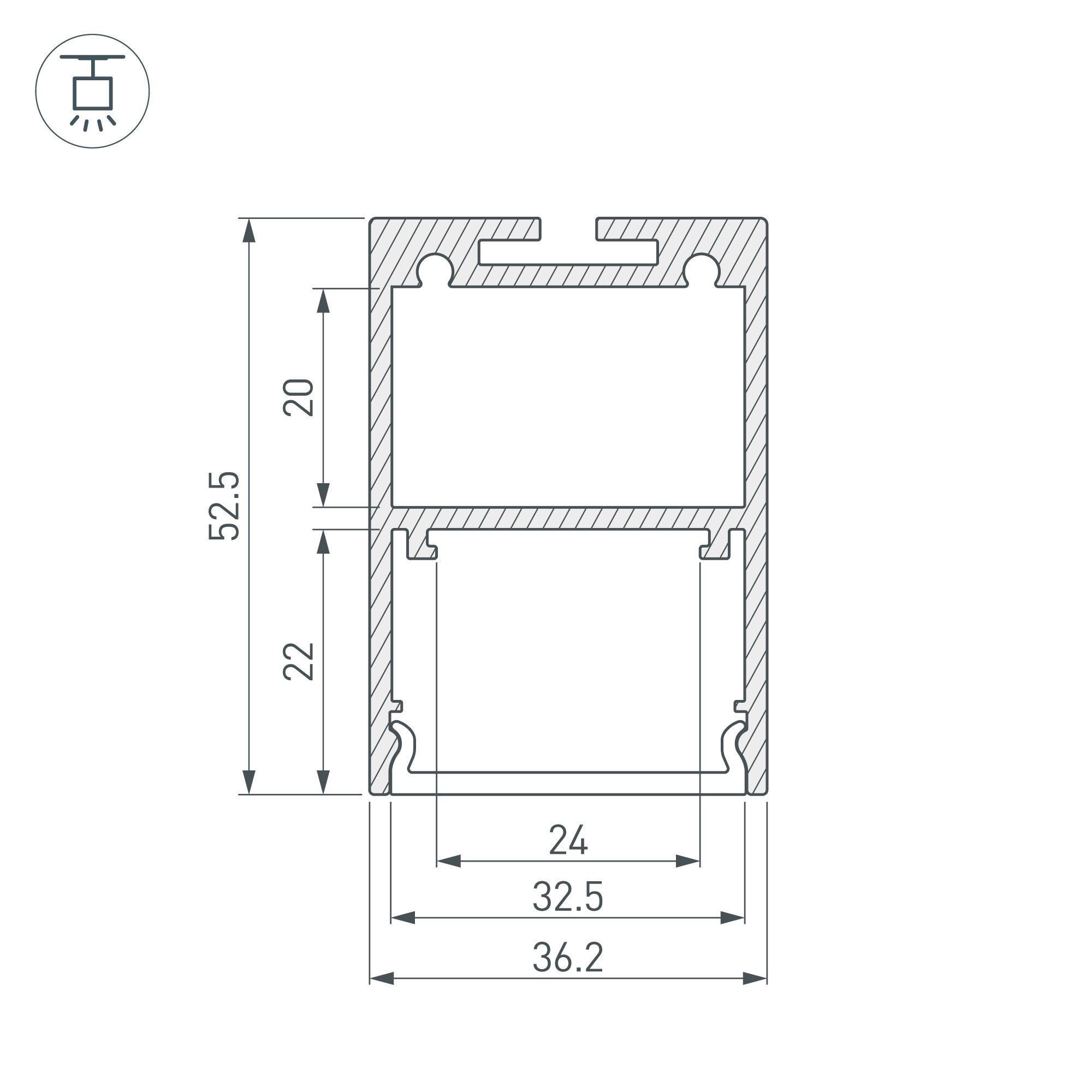 Подвесной профиль из анодированного алюминия с отсеком для блока питания (32х20 мм) для контурной подсветки помещений. Габаритные размеры профиля составляют 3000 мм в длину, 36,2 мм в ширину и 52,5 мм в высоту. Площадка для установки светодиодных лент позволяет использовать ленту шириной до 24 мм и мощностью до 46,5 Вт/м. Это обеспечивает гибкость в выборе светодиодных лент и создает потрясающие световые решения. Экраны, заглушки и другие аксессуары не включены в комплект и приобретаются отдельно. Цена указана за 1 метр профиля. Отличное решение для создания современных световых проектов.