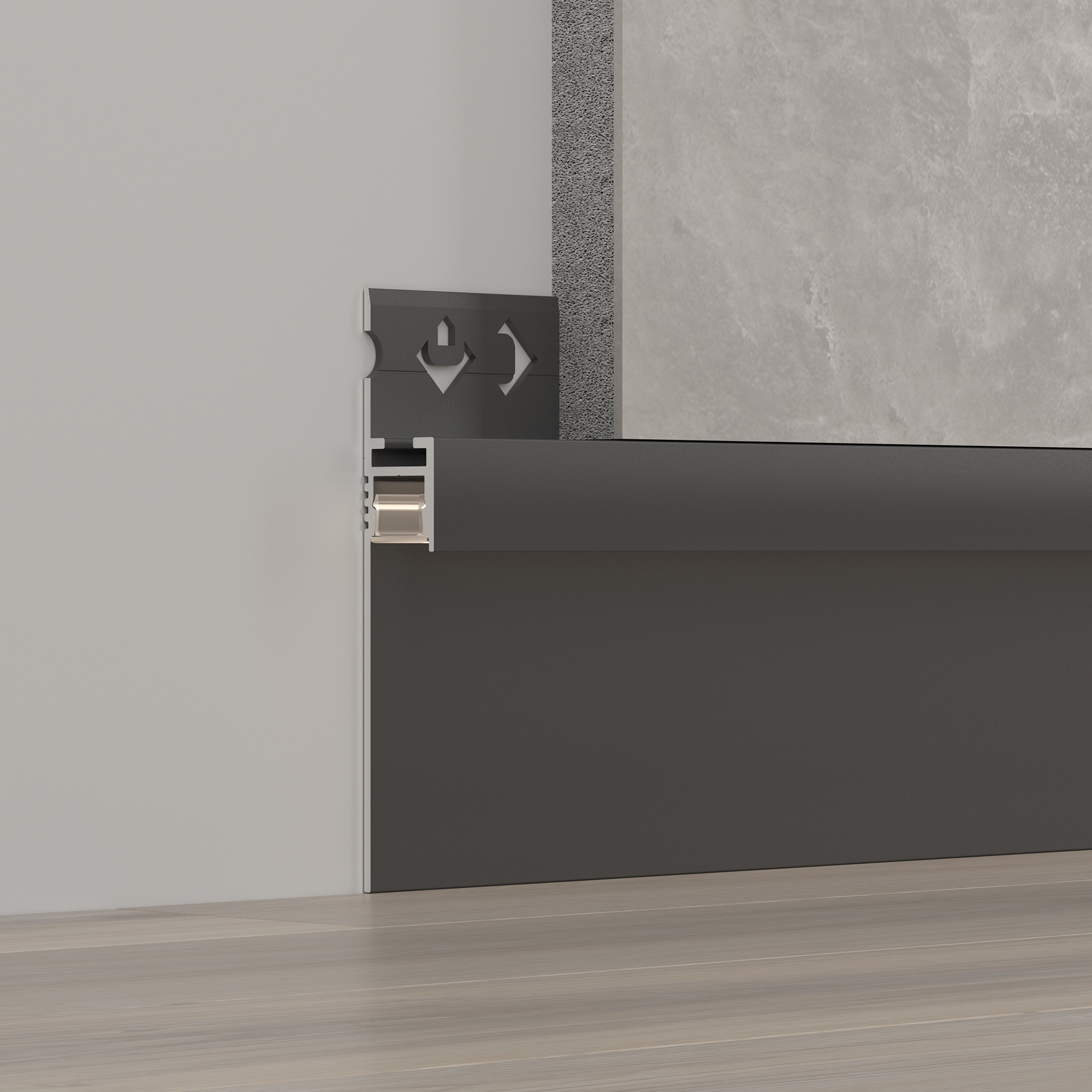 Алюминиевый профиль черного цвета, встраиваемый в гипсокартон, под строительную отделку. Служит как декоративная накладка для подсветки пола и стен, создавая мягкое свечение по периметру помещения, эффект парящей стены или потолка, не является плинтусом. Габаритные размеры профиля составляют 3000 мм в длину, 13,2 мм в ширину и 85 мм в высоту. Высота от пола до световой линии составляет 50 мм. Площадка для установки светодиодных лент позволяет использовать ленту шириной до 9,2 мм и мощностью до 33 Вт/м. Это обеспечивает гибкость в выборе светодиодных лент и создает потрясающие световые решения. Экран не включен в комплект и приобретается отдельно. Цена указана за 1 метр профиля. Отличное решение для создания современных световых проектов.