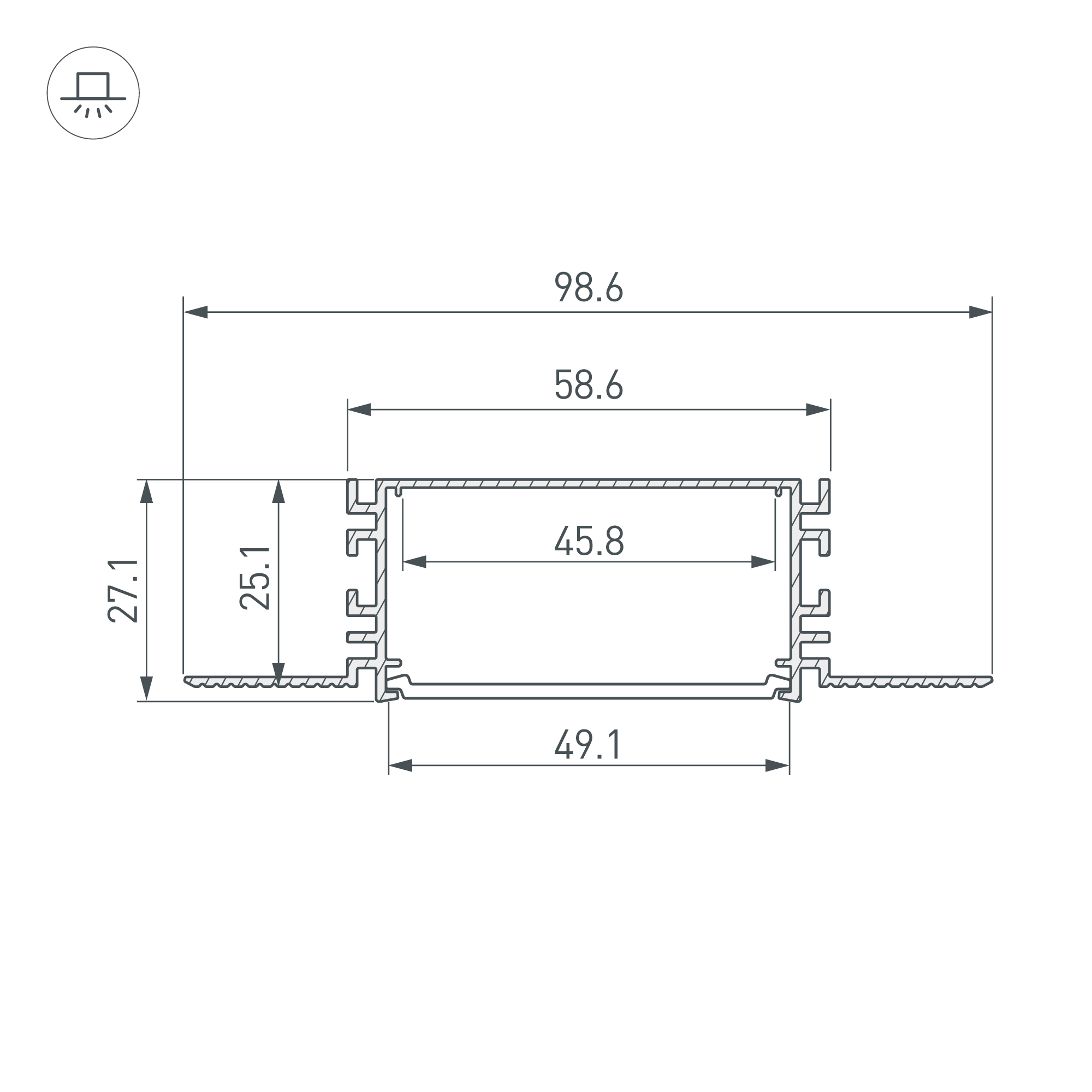 Встраиваемый профиль из анодированного алюминия со скрытым фланцем под строительную отделку устанавливается в потолки и потолочные ниши из гипсокартона. Габаритные размеры профиля составляют 2000 мм в длину, 98,6 мм в ширину и 27,1 мм в высоту. Площадка для установки светодиодных лент позволяет использовать ленту шириной до 45,8 мм и мощностью до 54 Вт/м. Это обеспечивает гибкость в выборе светодиодных лент и создает потрясающие световые решения. Совместим с гибкими алюминиевыми профилями FANTOM-BENT-W49-TOP и FANTOM-BENT-W49-SIDE. Сочетание разных видов профиля поможет подчеркнуть как прямые, так и изогнутые контуры интерьера, а также создать круги и волнообразные линии, переходящие с потолка на стены. Экраны, заглушки и другие аксессуары не включены в комплект и приобретаются отдельно. Цена указана за 1 метр профиля.
