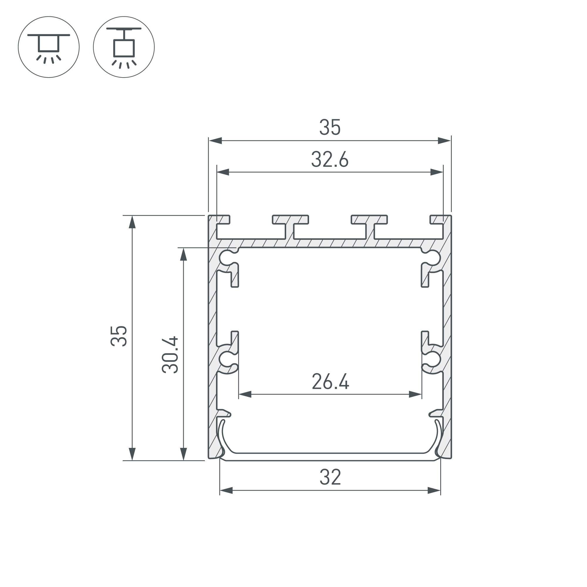 Подвесной/накладной профиль черного цвета из алюминия для основного освещения и контурной подсветки. Габаритные размеры профиля составляют 2500 мм в длину, 35 мм в ширину и 35 мм в высоту. Площадка для установки светодиодных лент позволяет использовать ленту шириной до 26,4 мм и мощностью до 37 Вт/м. Это обеспечивает гибкость в выборе светодиодных лент и создает потрясающие световые решения. Экраны, заглушки и другие аксессуары не включены в комплект и приобретаются отдельно. Цена указана за 1 метр профиля. Отличное решение для создания современных световых проектов. При изготовлении светильников длиной, превышающей длину профиля, соединители необходимо крепить к стенками профиля винтами с минимальным усилием, до первого ощущения сопротивления.
