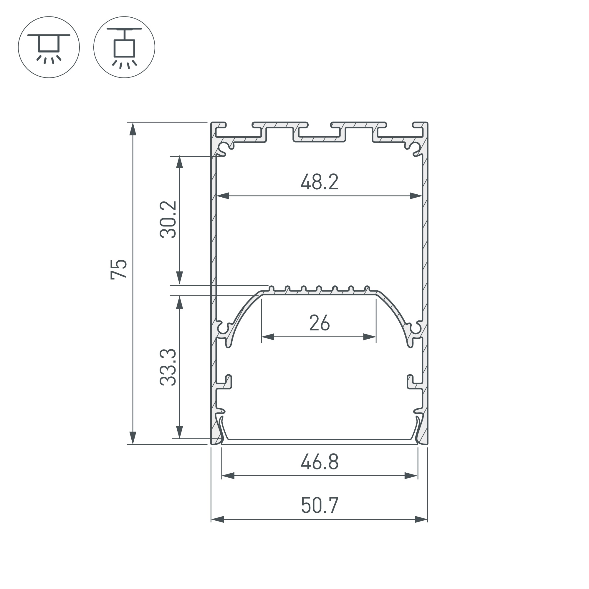 Подвесной/накладной профиль белого цвета из алюминия с отсеком для блока питания (48,2х30,2 мм) для основного освещения и контурной подсветки. Габаритные размеры профиля составляют 2500 мм в длину, 50,7 мм в ширину и 75 мм в высоту. Площадка для установки светодиодных лент позволяет использовать ленту шириной до 26 мм и мощностью до 65 Вт/м. Это обеспечивает гибкость в выборе светодиодных лент и создает потрясающие световые решения. Экраны, заглушки и другие аксессуары не включены в комплект и приобретаются отдельно. Цена указана за 1 метр профиля. Отличное решение для создания современных световых проектов. При изготовлении светильников длиной, превышающей длину профиля, соединители необходимо крепить к стенками профиля винтами с минимальным усилием, до первого ощущения сопротивления.