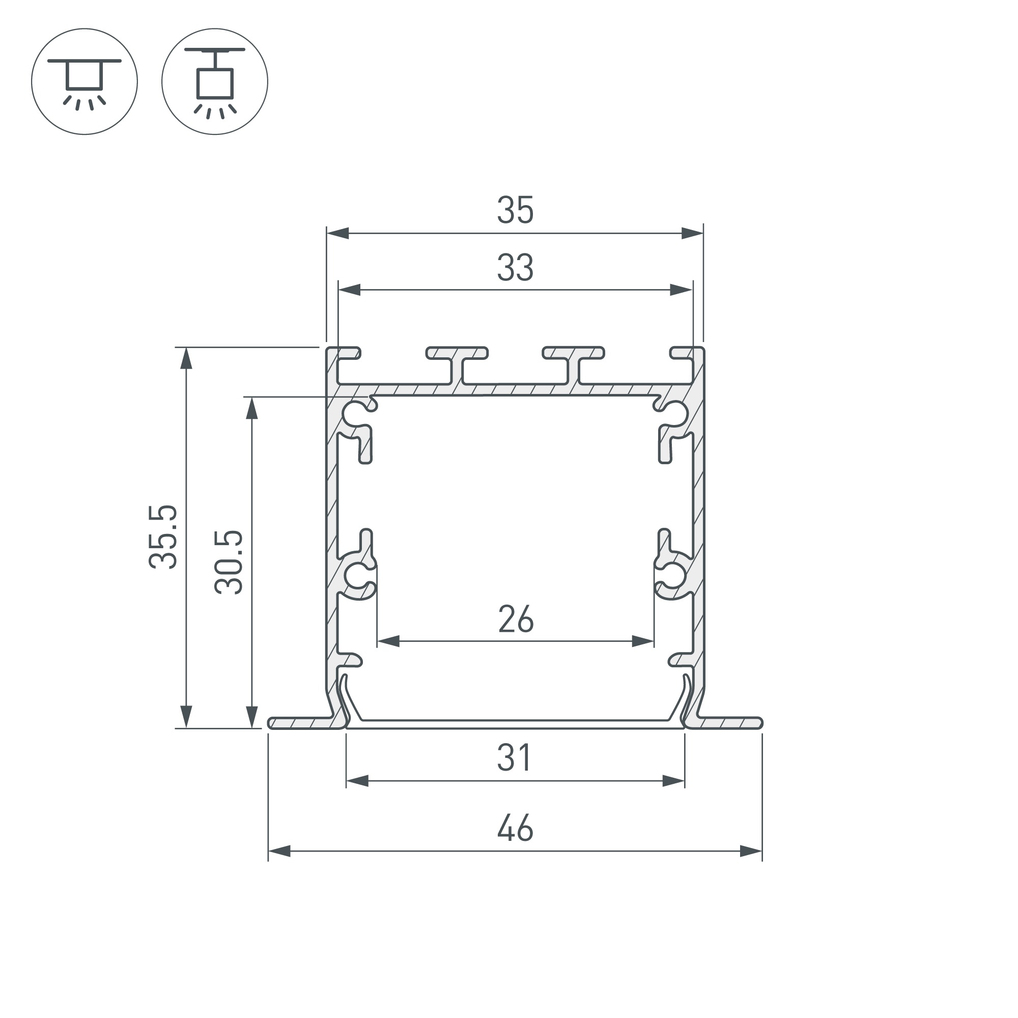 Встраиваемый профиль с накладным фланцем черного цвета из алюминия для основного освещения и контурной подсветки. Габаритные размеры профиля составляют 2000 мм в длину, 46 мм в ширину и 35,5 мм в высоту. Площадка для установки светодиодных лент позволяет использовать ленту шириной до 26 мм и мощностью до 37 Вт/м. Это обеспечивает гибкость в выборе светодиодных лент и создает потрясающие световые решения. Экраны, заглушки и другие аксессуары не включены в комплект и приобретаются отдельно. Цена указана за 1 метр профиля. Отличное решение для создания современных световых проектов. При изготовлении светильников длиной, превышающей длину профиля, соединители необходимо крепить к стенками профиля винтами с минимальным усилием, до первого ощущения сопротивления.
