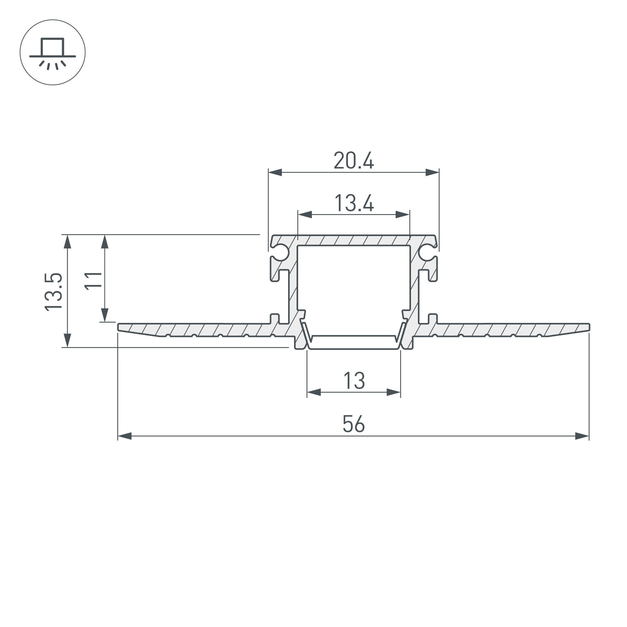 Алюминиевый профиль для светодиодных лент и линеек. Габаритные размеры (L×W×H): 3000x56x13,5 мм. Ширина площадки для ленты 13,4 мм. Экраны, заглушки и другие аксессуары приобретаются отдельно. Цена за 1 метр. Поставляется в комплекте с дополнительным экраном, который служит защитой профиля от пыли при монтаже.