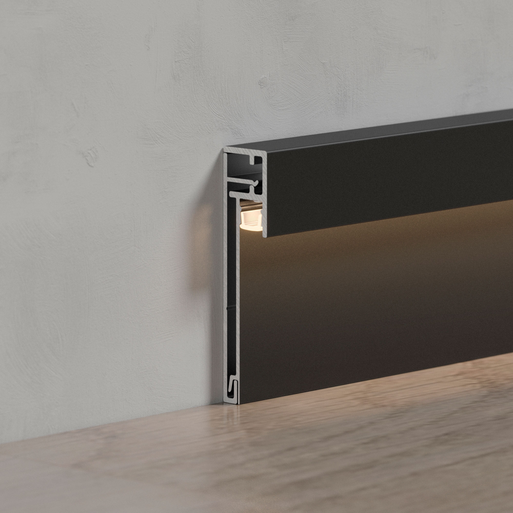Накладной двухкомпонентный алюминиевый профиль-плинтус черного цвета для контурной подсветки помещения. Габаритные размеры профиля составляют 2000 мм в длину, 12,3 мм в ширину и 52,6 мм в высоту. Площадка для установки светодиодных лент позволяет использовать ленту шириной до 5 мм и мощностью до 20 Вт/м. Это обеспечивает гибкость в выборе светодиодных лент и создает потрясающие световые решения. Экран, заглушки и другие аксессуары не включены в комплект и приобретаются отдельно. Цена указана за 1 метр профиля. Простая установка без предварительной подготовки стен. Отличное решение для создания современных световых проектов.