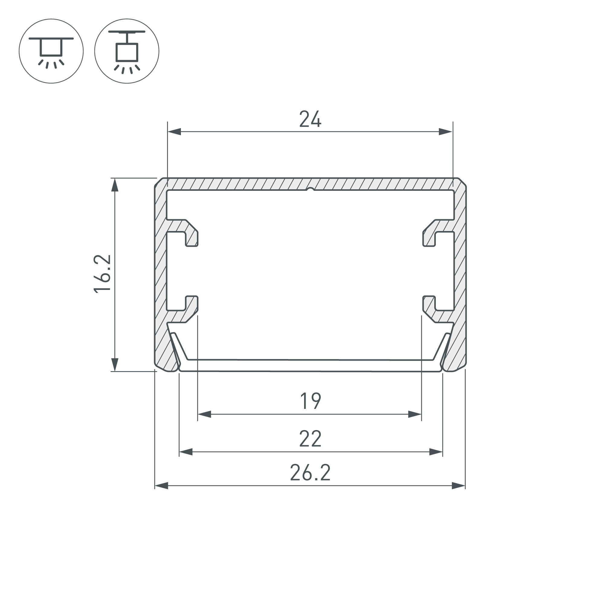 Накладной/подвесной профиль из анодированного алюминия для основного освещения и контурной подсветки. Габаритные размеры профиля составляют 3000 мм в длину, 26,2 мм в ширину и 16,2 мм в высоту. Площадка для установки светодиодных лент позволяет использовать ленту шириной до 24 мм и мощностью до 21,8 Вт/м. Это обеспечивает гибкость в выборе светодиодных лент и создает потрясающие световые решения. Экраны, заглушки и другие аксессуары не включены в комплект и приобретаются отдельно. Цена указана за 1 метр профиля. Отличное решение для создания современных световых проектов.