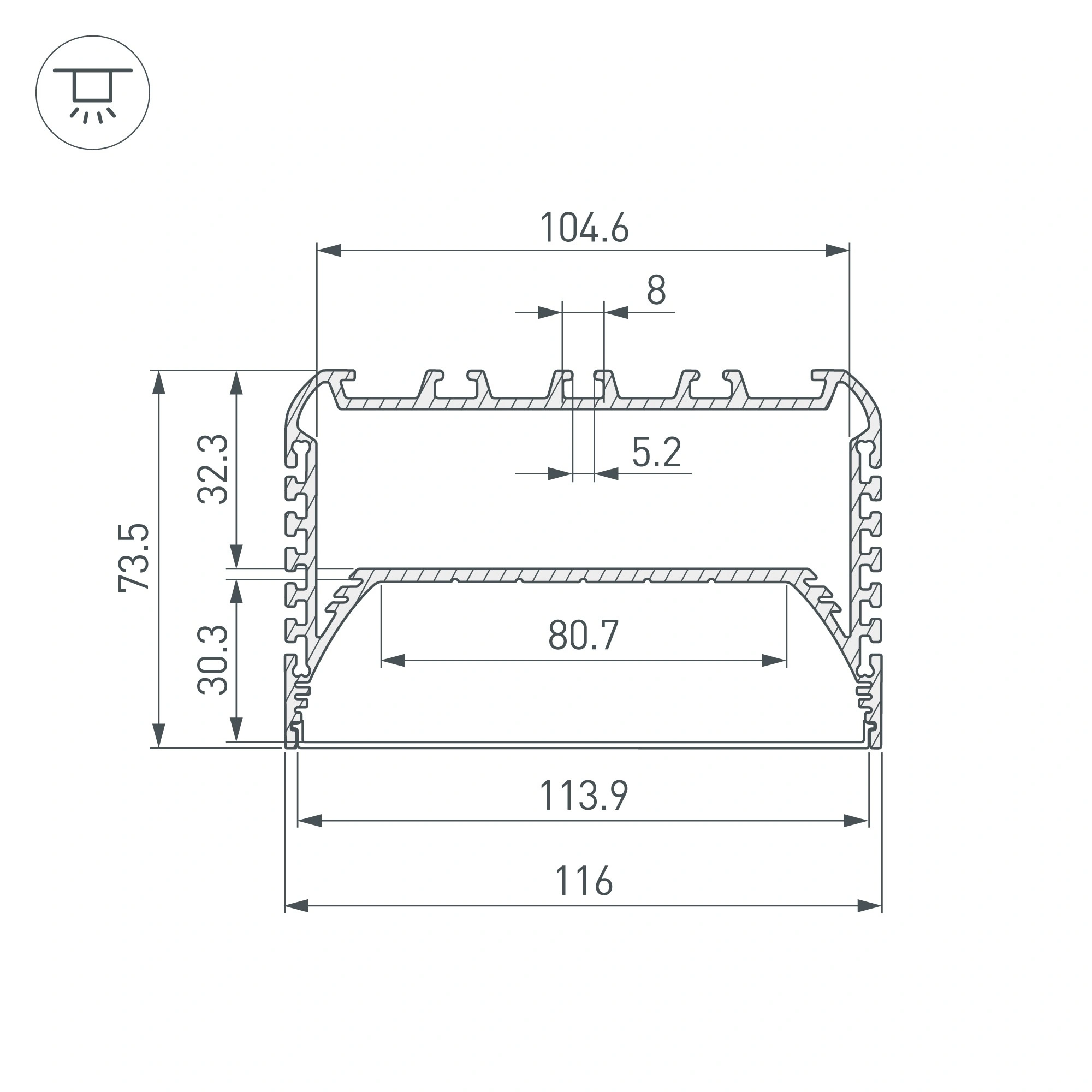 Комплект с экраном. Алюминиевый профиль для светодиодных лент и линеек, с отсеком для блока питания. Размер отсека 106х32мм. Габаритные размеры (L×W×H): 2000x116x73,5 мм. Ширина площадки для ленты 80 мм. Аксессуары приобретаются отдельно. Цена за комплект. Минимальный заказ 1 комплект.