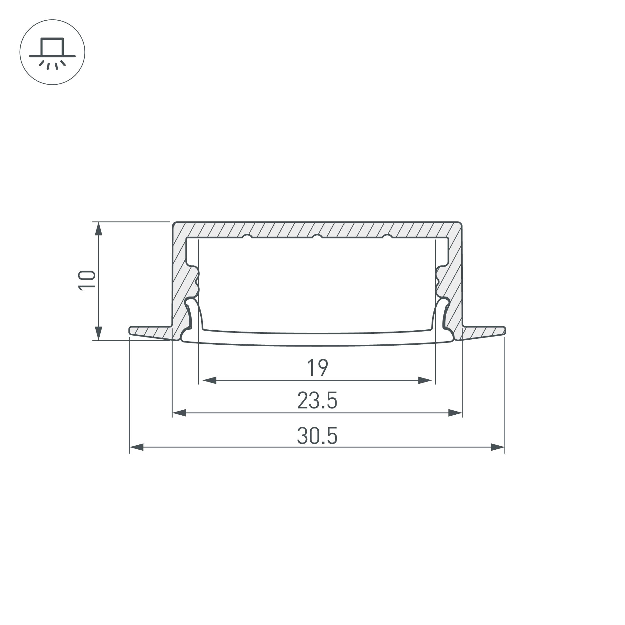 Алюминиевый анодированный встраиваемый профиль для светодиодных лент и линеек. Габаритные размеры (L×W×H): 2000x30,5x10 мм. Паз для установки 23,5мм. Ширина площадки для ленты 19 мм.