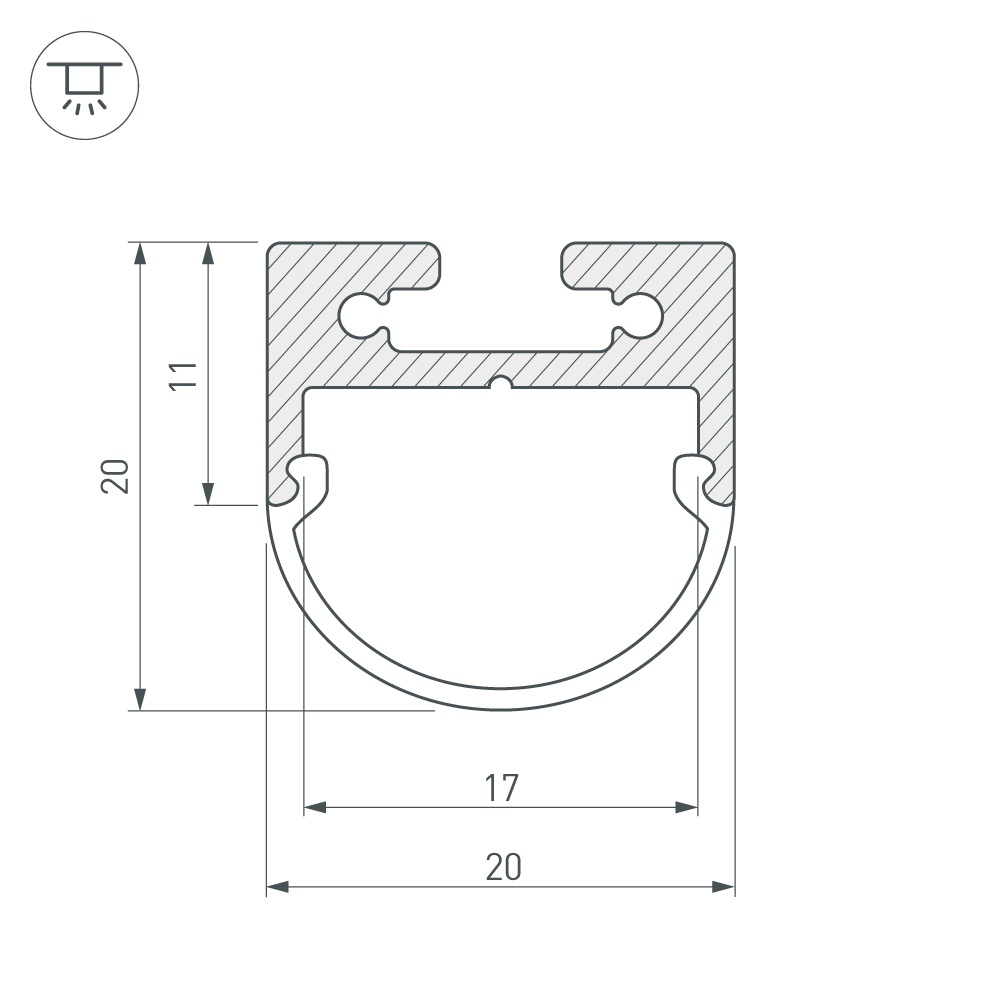 Комплект с экраном. Подвесной/накладной профиль 20х20мм для линейных светильников. В комплекте с круглым матовым экраном. Анодированный алюминий. Длина 2500мм. Цена за комплект 2,5м. Заглушки, держатели и подвесы отдельно.