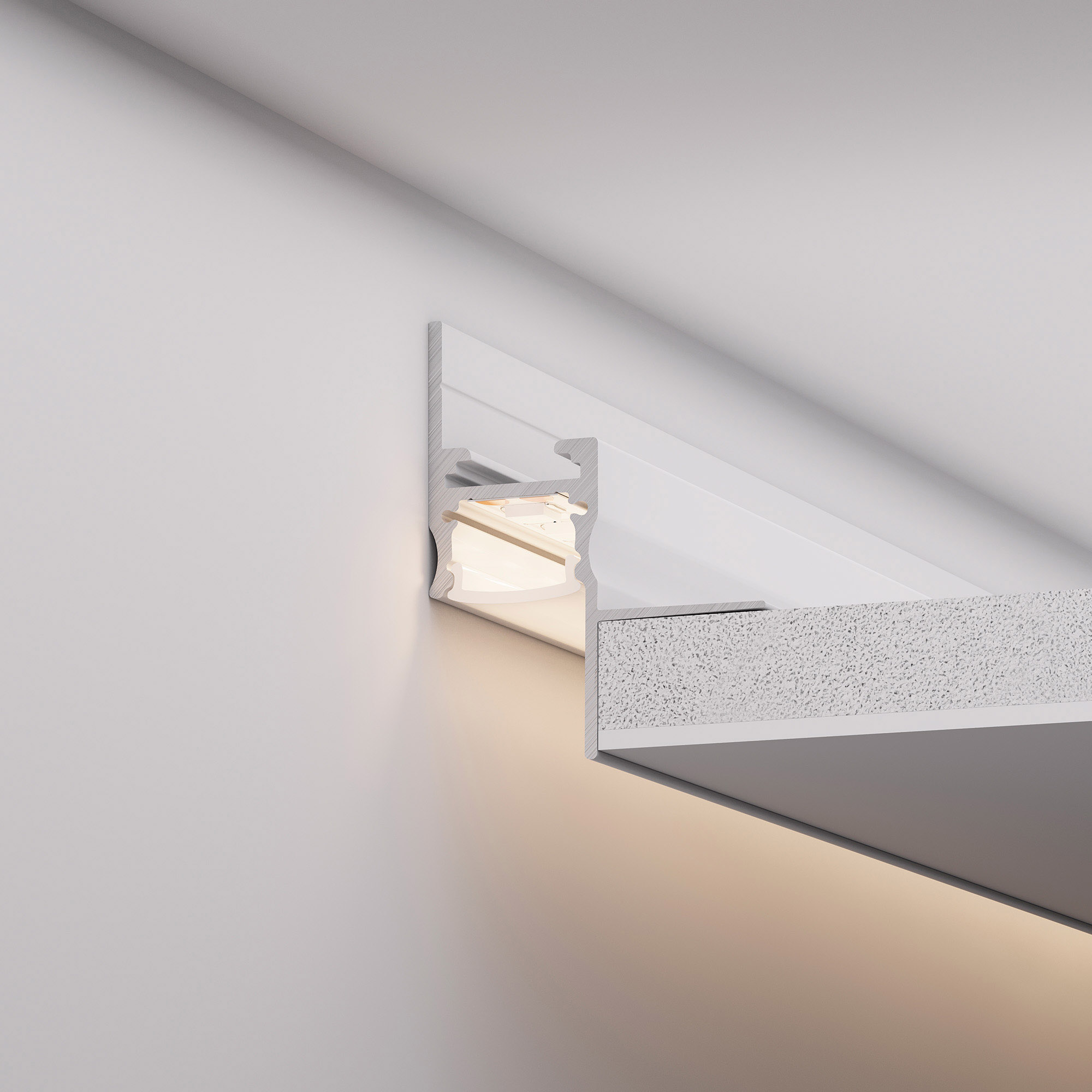 Встраиваемый алюминиевый профиль белого цвета со скрытым фланцем устанавливается в потолки и потолочные ниши из гипсокартона, образуя теневой зазор между потолком и стеной. Такое решение создает визуальный эффект потолка, парящего в воздухе с мягким свечением по периметру комнаты. Габаритные размеры профиля составляют 2000 мм в длину, 41,2 мм в ширину и 51 мм в высоту. Площадка для установки светодиодных лент позволяет использовать ленту шириной до 13,3 мм и мощностью до 33 Вт/м. Это обеспечивает гибкость в выборе светодиодных лент и создает потрясающие световые решения. Экраны, заглушки и другие аксессуары не включены в комплект и приобретаются отдельно. Цена указана за 1 метр профиля. Отличное решение для создания современных световых проектов.