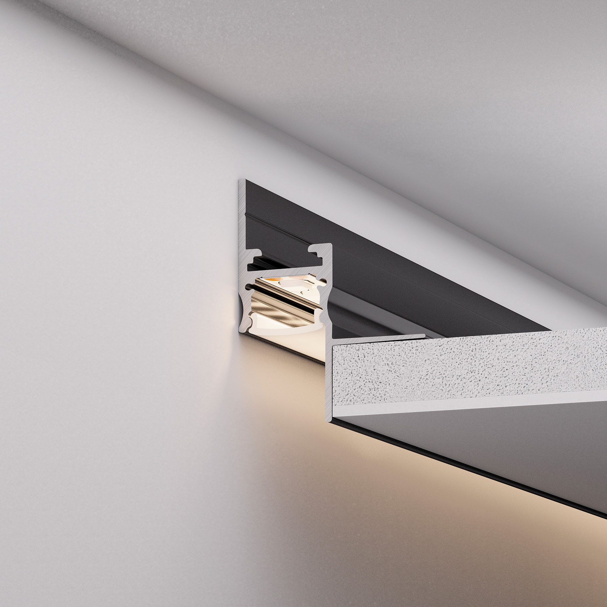 Встраиваемый алюминиевый профиль черного цвета со скрытым фланцем устанавливается в потолки и потолочные ниши из гипсокартона, образуя теневой зазор между потолком и стеной. Такое решение создает визуальный эффект потолка, парящего в воздухе с мягким свечением по периметру комнаты. Габаритные размеры профиля составляют 3000 мм в длину, 41,2 мм в ширину и 51 мм в высоту. Площадка для установки светодиодных лент позволяет использовать ленту шириной до 13,3 мм и мощностью до 33 Вт/м. Это обеспечивает гибкость в выборе светодиодных лент и создает потрясающие световые решения. Экраны, заглушки и другие аксессуары не включены в комплект и приобретаются отдельно. Цена указана за 1 метр профиля. Отличное решение для создания современных световых проектов.
