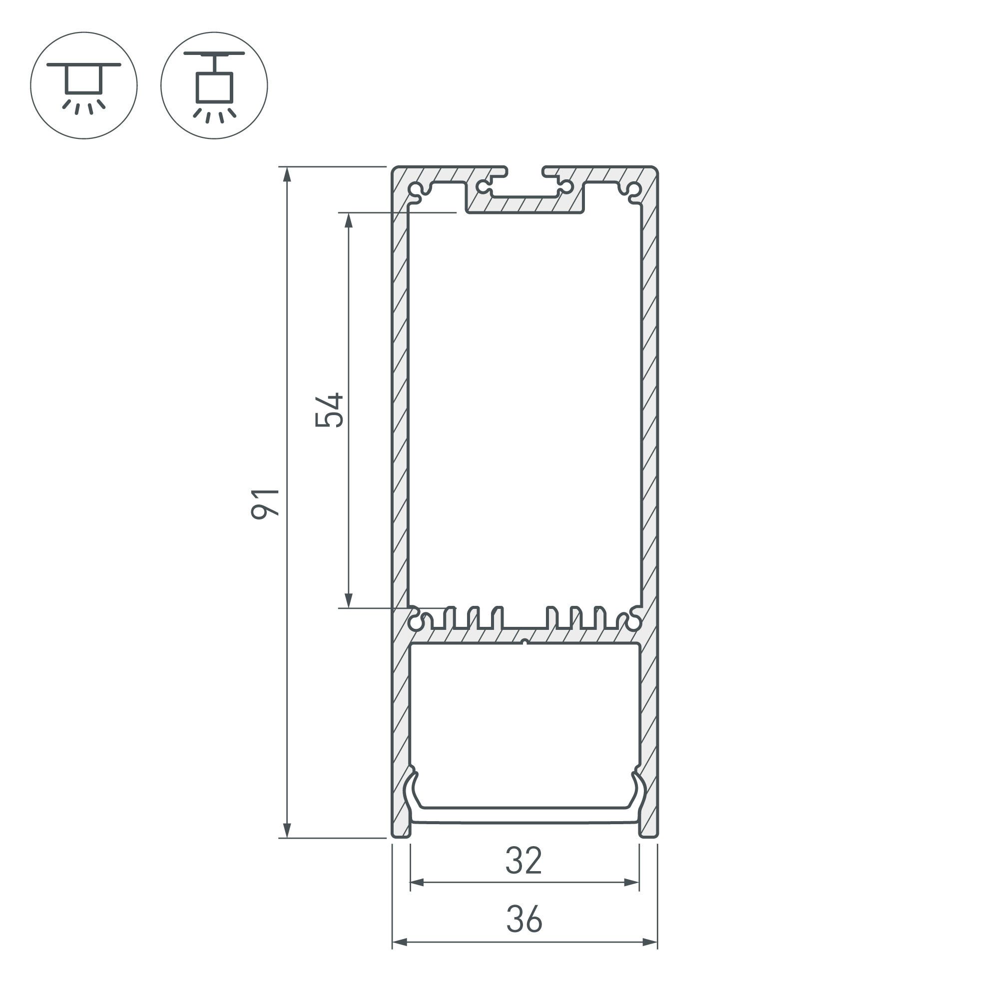 Подвесной/накладной профиль из анодированного алюминия с отсеком для блока питания (32х54 мм) для контурной подсветки помещений. Габаритные размеры профиля составляют 2000 мм в длину, 36 мм в ширину и 91 мм в высоту. Площадка для установки светодиодных лент позволяет использовать ленту шириной до 32 мм и мощностью до 66 Вт/м. Это обеспечивает гибкость в выборе светодиодных лент и создает потрясающие световые решения. Экраны, заглушки и другие аксессуары не включены в комплект и приобретаются отдельно. Цена указана за 1 метр профиля. Отличное решение для создания современных световых проектов.