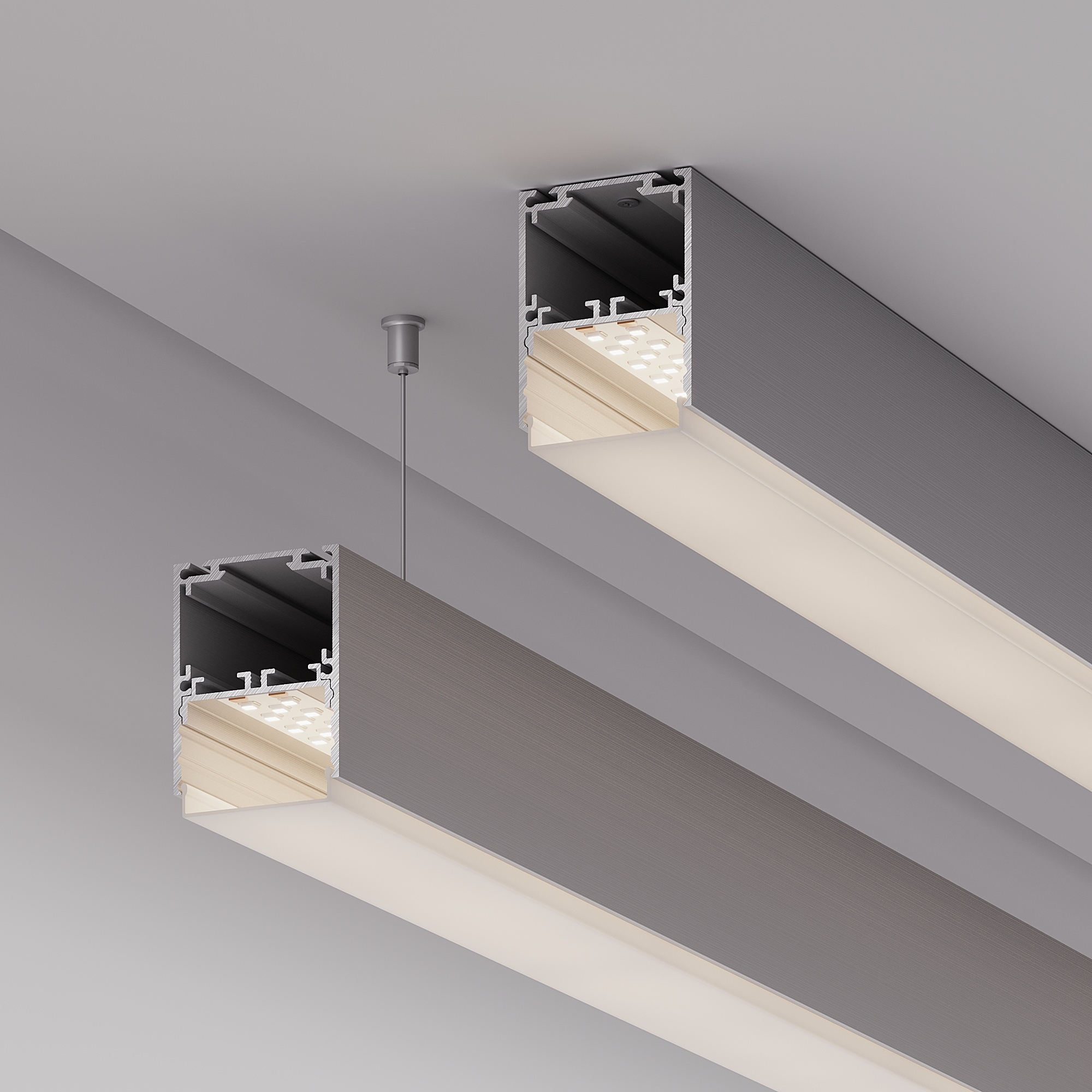 Подвесной/накладной профиль из анодированного алюминия для основного освещения и контурной подсветки. Возможность установки экрана на трех уровнях: выступая за края профиля, вровень с профилем и утоплено, позволяет получить разные световые эффекты. Отсек для блока питания (31,4х20,5 мм) и съемная площадка для светодиодной ленты значительно облегчают сервисное обслуживание осветительного оборудования. Габаритные размеры профиля составляют 2000 мм в длину, 40 мм в ширину и 50,6 мм в высоту. Площадки для установки светодиодных лент позволяют использовать ленты шириной до 33 мм и мощностью до 47 Вт/м. Это обеспечивает гибкость в выборе светодиодных лент и создает потрясающие световые решения. Экраны, заглушки и другие аксессуары не включены в комплект и приобретаются отдельно. Цена указана за 1 метр профиля. Отличное решение для создания современных световых проектов.