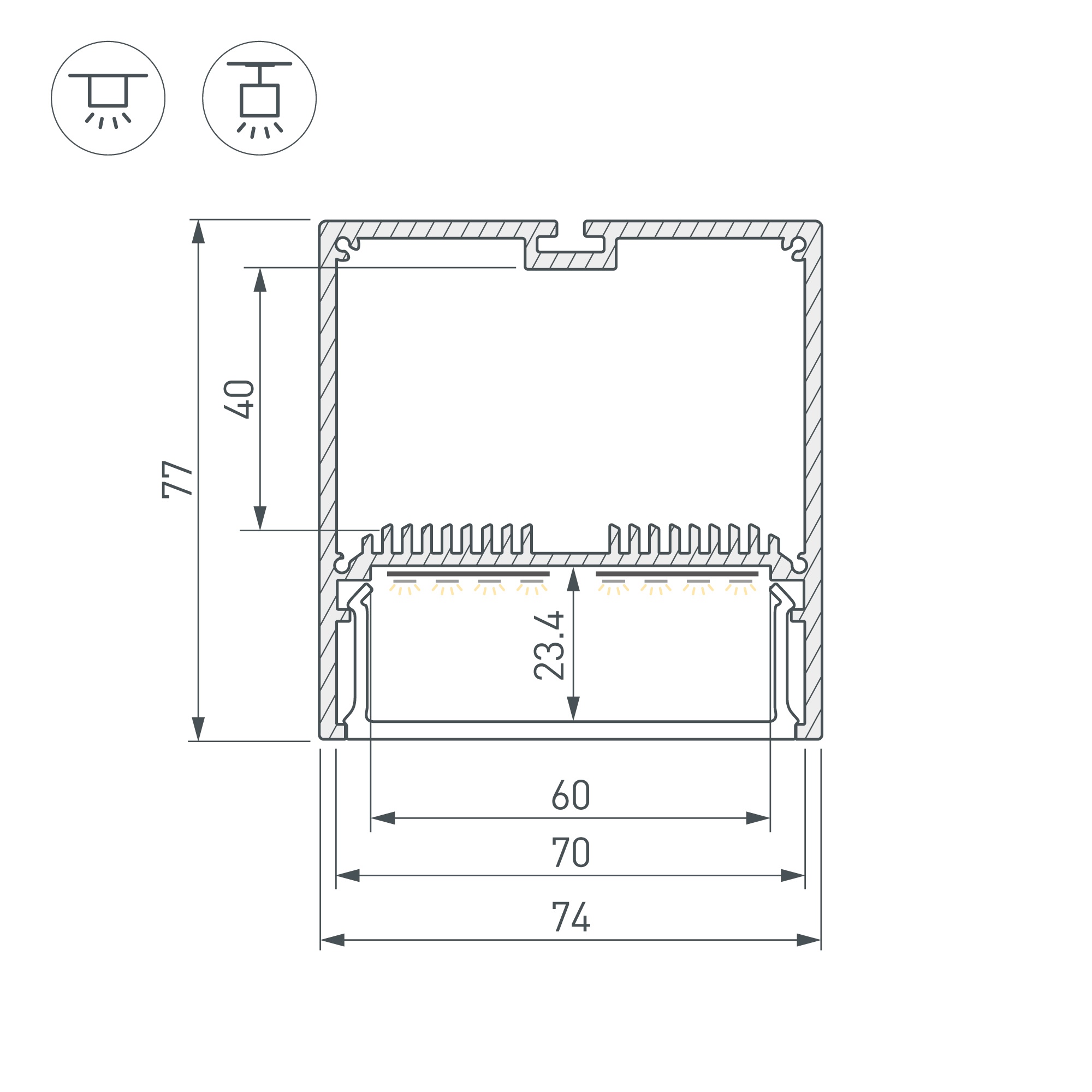 Подвесной/накладной профиль из анодированного алюминия для основной и контурной подсветки помещений. Габаритные размеры профиля составляют 2000 мм в длину, 74 мм в ширину и 77 мм в высоту. Площадка для установки светодиодных лент позволяет использовать ленту шириной до 60 мм и мощностью до 79,2 Вт/м. Это обеспечивает гибкость в выборе светодиодных лент и создает потрясающие световые решения. Монтаж осуществляется накладным либо подвесным способом. Для накладного монтажа на держатель 019911 на 1 метр профиля рекомендуем использовать не менее 5-ти держателей. Экраны, заглушки и другие аксессуары не включены в комплект и приобретаются отдельно. Цена указана за 1 метр профиля. Отличное решение для создания современных световых проектов.