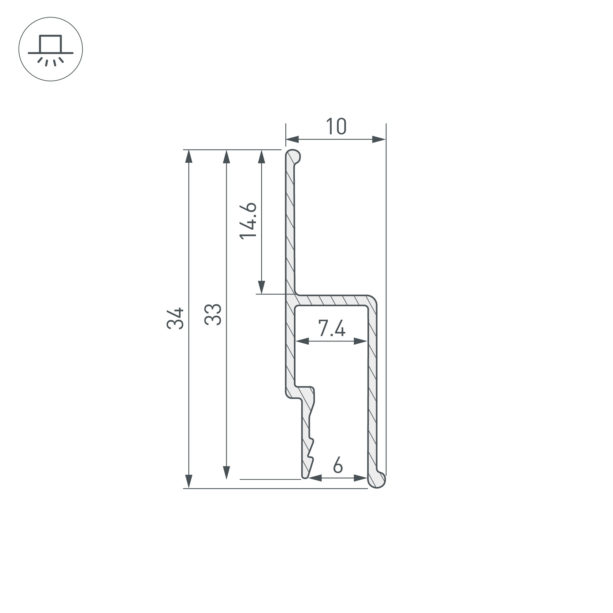 Накладной алюминиевый профиль для монтажа натяжного потолка с использованием гарпунной системы. Габаритные размеры профиля составляют 2500 мм в длину, 10 мм в ширину и 34 мм в высоту. Цена указана за 1 метр профиля.