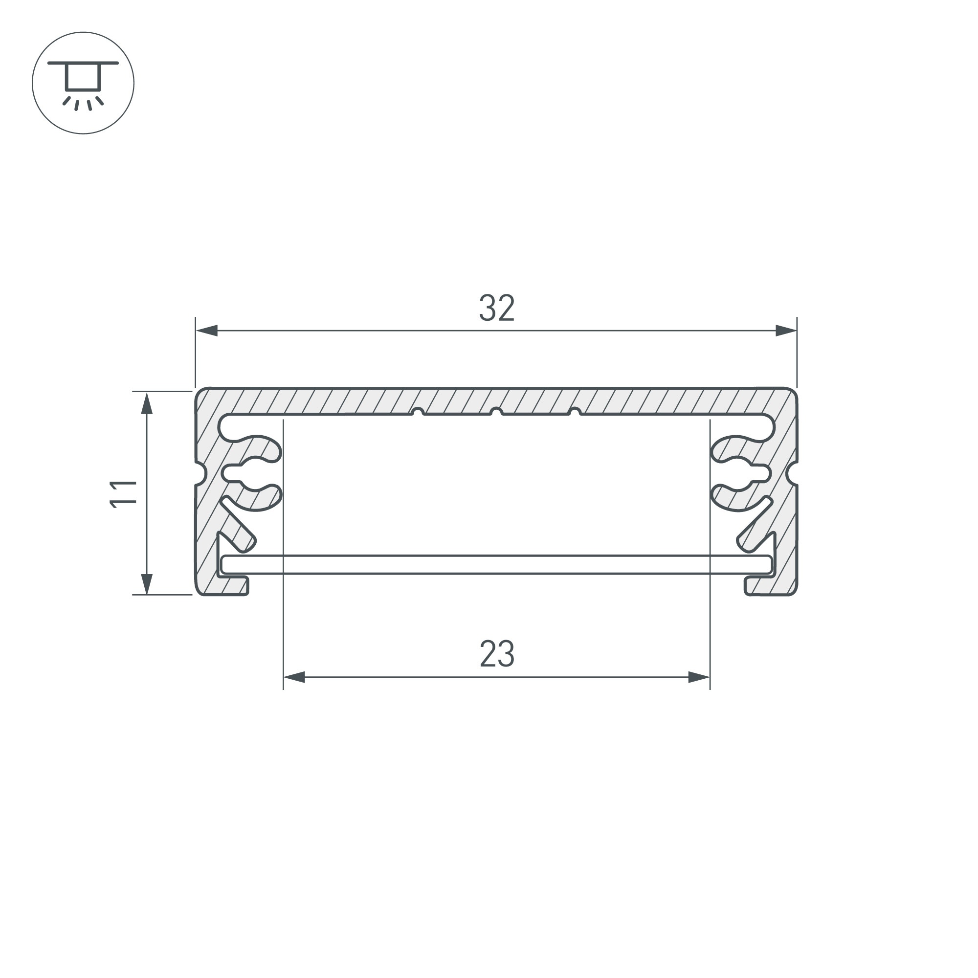 Алюминиевый профиль для светодиодных лент и линеек. Габаритные размеры (L×W×H): 2000x32x11 мм. Ширина площадки для ленты 23 мм. Экраны, заглушки и другие аксессуары приобретаются отдельно. Цена за 1 метр.