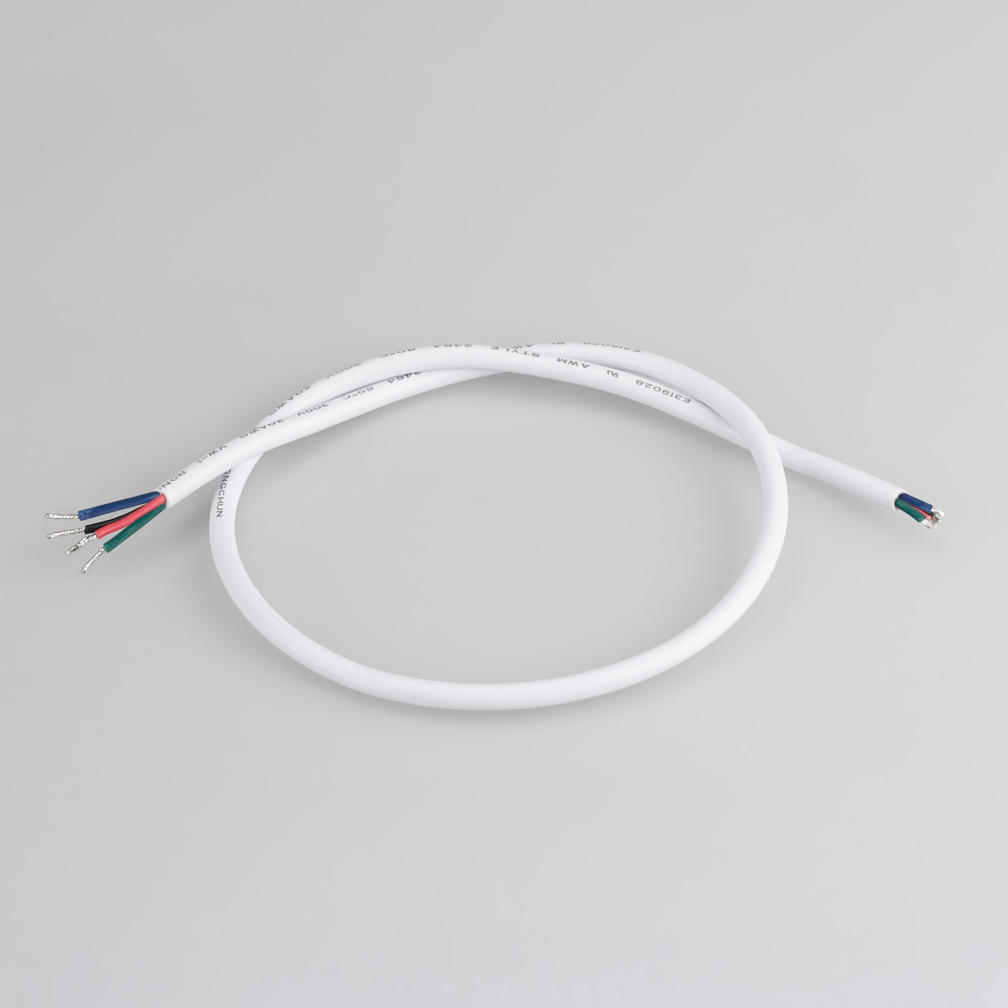 Провод питания для RGB гибкого неона MOONLIGHT. 4 проводника, калибр проводника 20AWG, материал проводника - лужёная медь, внешний диаметр 4,5 мм. Внешняя оболочка - ПВХ белого цвета. Длина кабеля в отрезке - 500 мм.