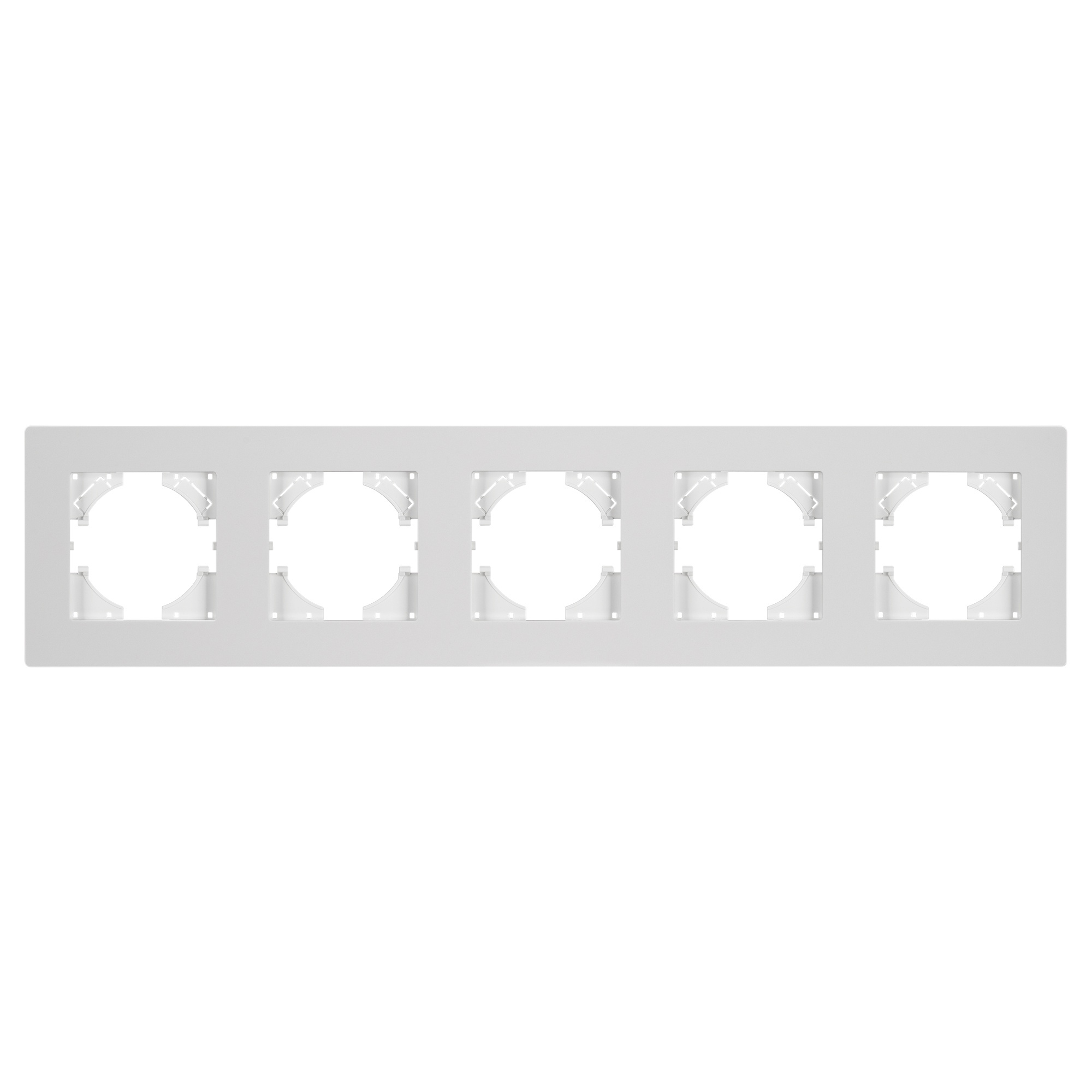 Рамка пластиковая на 5 постов, под встраиваемый механизм. Цвет - белый. Среднего уровня герметичности IP20. Ориентация монтажа - горизонтальная (основным ориентиром служат посадочные выступы для накладки механизма).