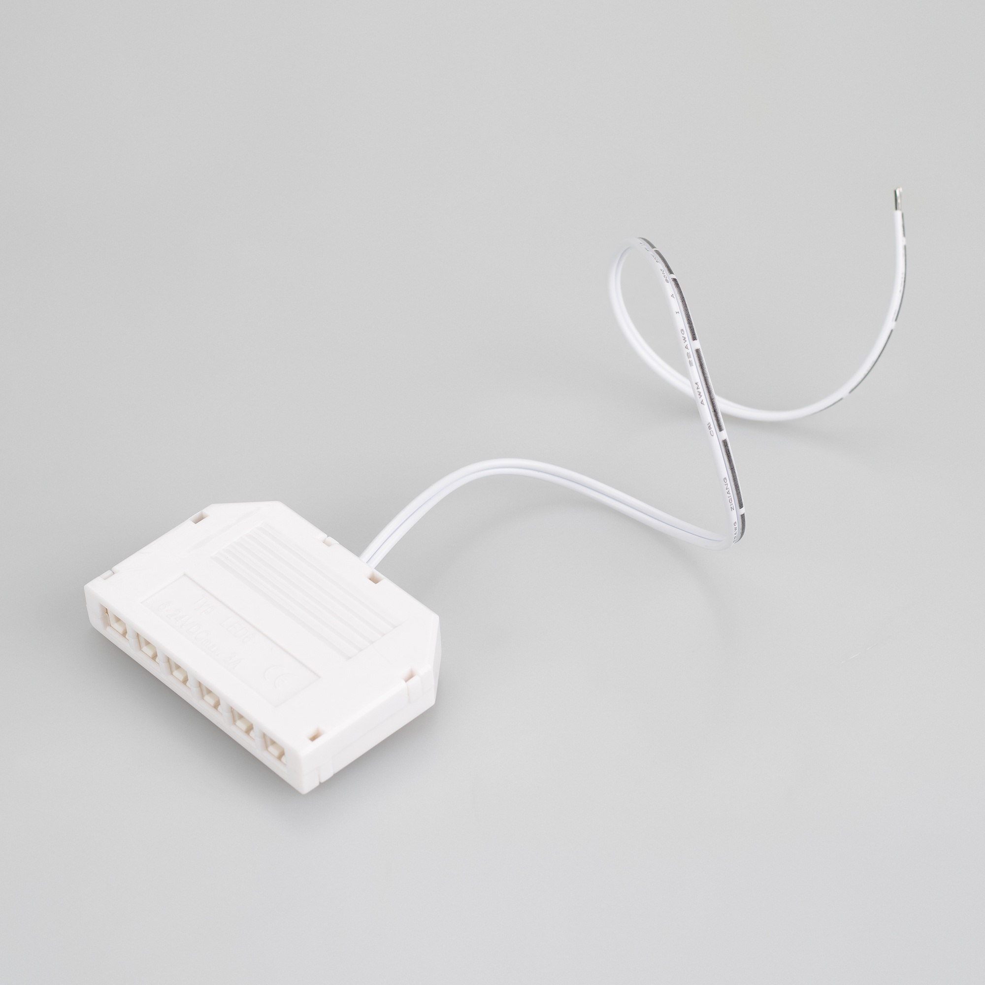 Разветвитель для подключения до 6-х линеек BAR к одному источнику напряжения. 6 разъёмов dupont terminal "МАМА". Максимальный ток нагрузки 3А, напряжение DC 12-24V. Провод 300мм 22AWG.