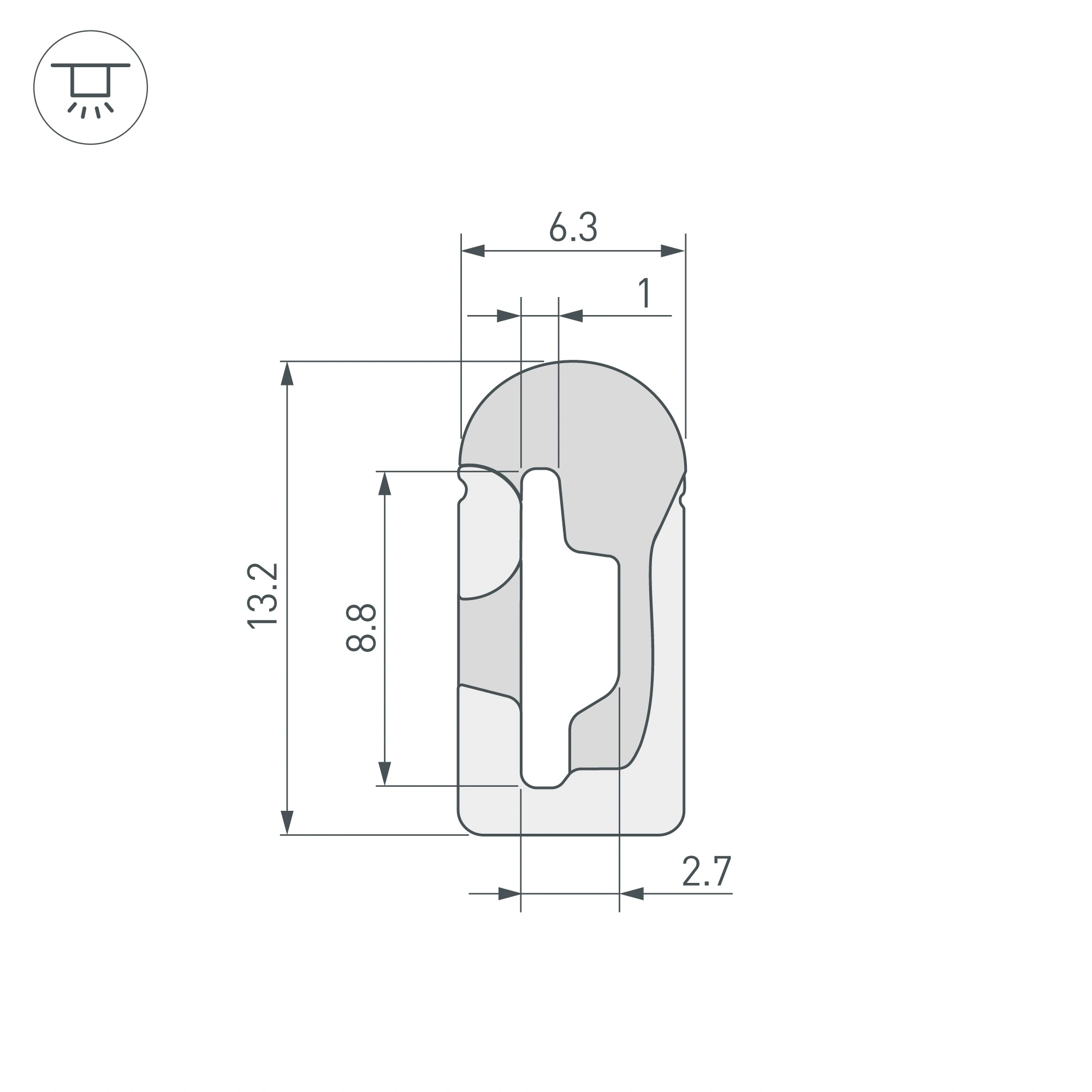 Цельнолитой силиконовый гибкий профиль белого цвета с УФ-защитой. Габаритные размеры профиля составляют 10000 мм в длину, 6,3 мм в ширину и 13,2 мм в высоту. Горизонтальный изгиб SIDE, минимальный радиус изгиба 30 мм. Угол излучения 115°, поперечный угол излучения 180°. Для удобства установки ленты по всей длине профиля протянута нить. Площадка для установки светодиодных лент позволяет использовать ленту шириной от 5 до 8 мм, высотой до 2,7 мм и мощностью до 10 Вт/м. Это обеспечивает гибкость в выборе светодиодных лент и создает потрясающие световые решения. Для установки во влажных помещениях необходима герметизация при помощи двухкомпонентного эпоксидного герметика. Класс пылевлагозащиты – IP65 (при соблюдении технологии герметизации). Этот продукт представляет отличное решение для создания современных световых проектов и обеспечивает надежную и стильную основу для установки светодиодов. Для накладного монтажа на 1 метр профиля рекомендуем использовать не менее 5-ти держателей.