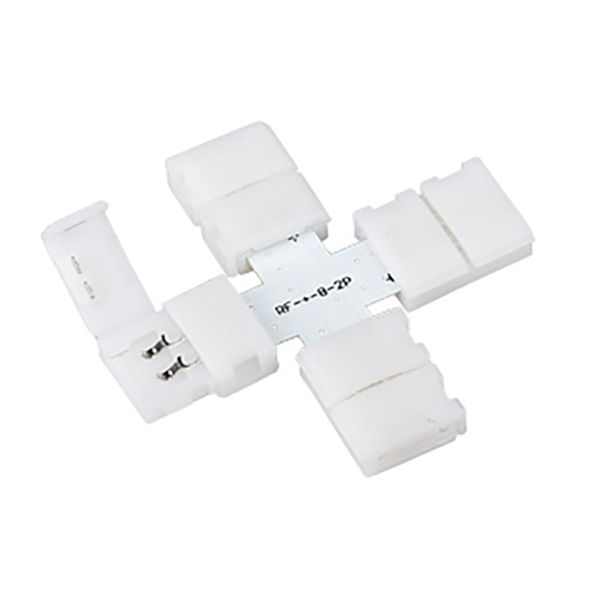 Разветвитель крестовой с разъемами на фиксаторах, для соединения одноцветных лент шириной 8мм. Максимальный допустимый ток 4А. Не рекомендуется соединять длинные отрезки лент.