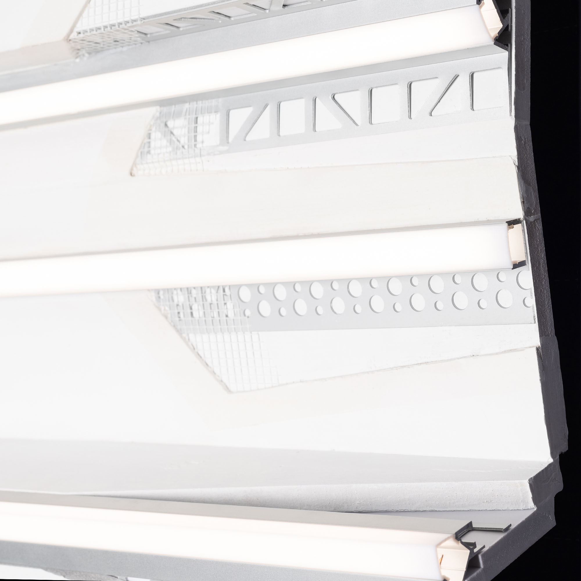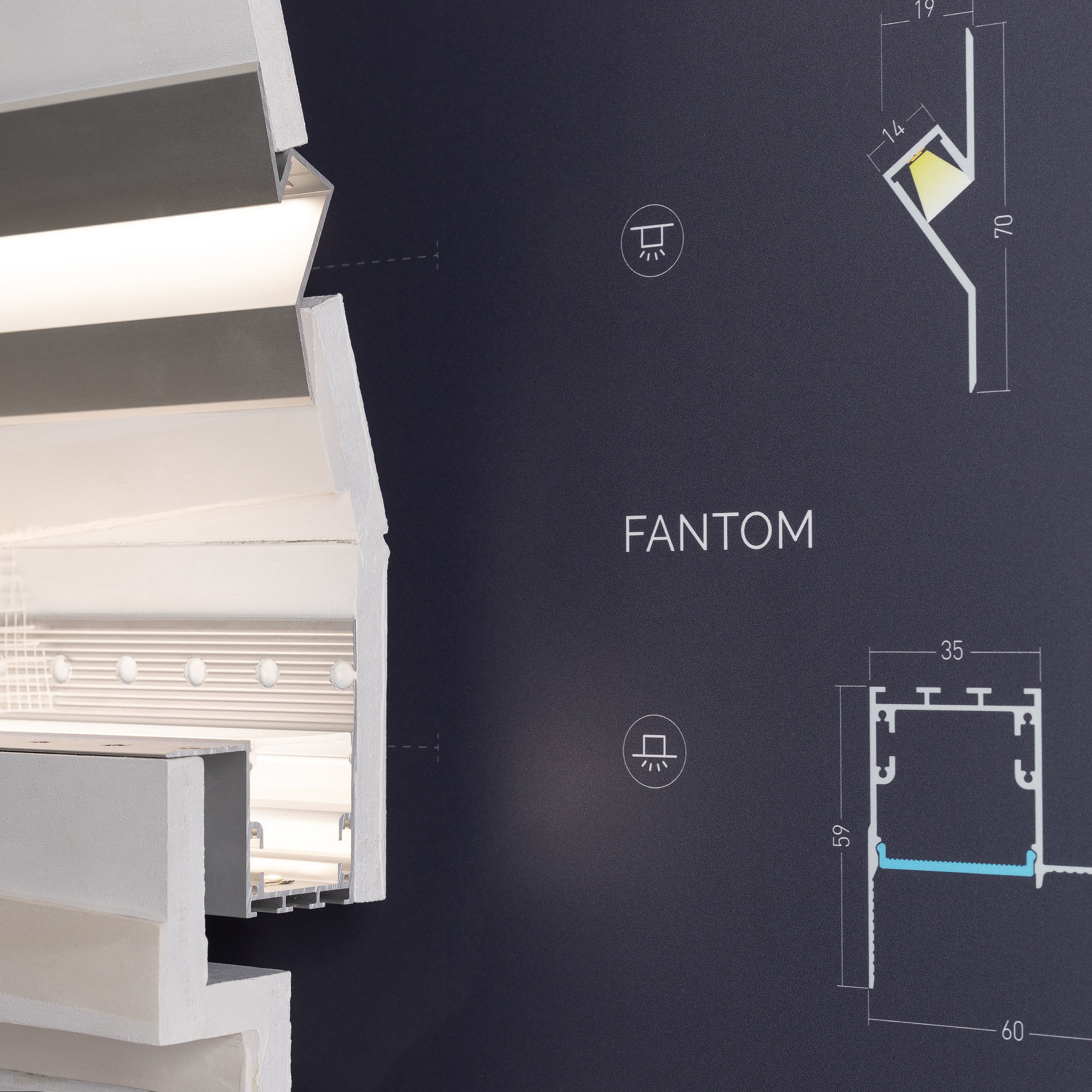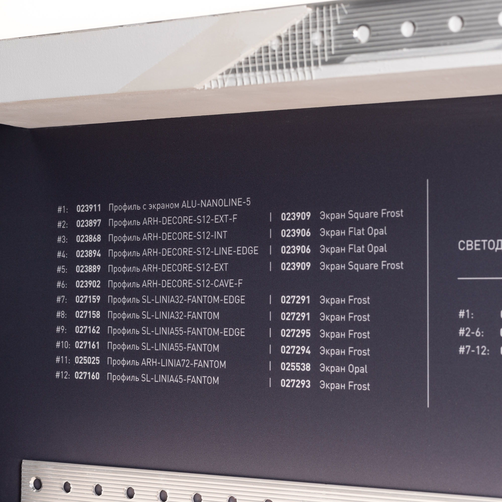 На стенде представлены алюминиевые профили для светодиодных лент серий FANTOM(широкие профили для скрытой встройки в гипсокартон) и DECORE (встраиваемые профили под строительную отделку).