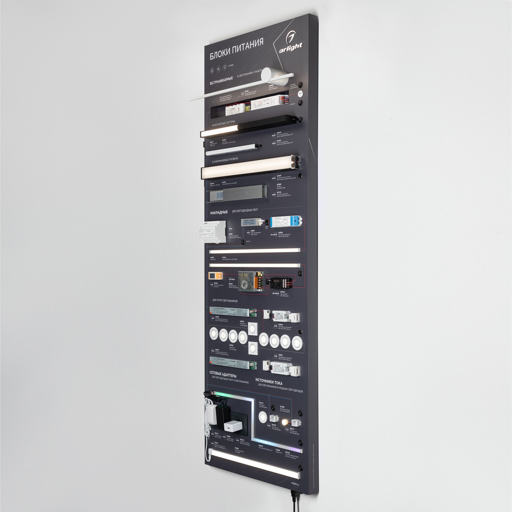 На стенде представлен широкий ассортимент блоков питания Arlight для различных источников освещения: светодиодные ленты, светильники, мощные светодиоды и т. п. Показаны варианты встройки блоков питания в ниши и в профиль. Реализован механизм плавного включения светодиодной ленты.