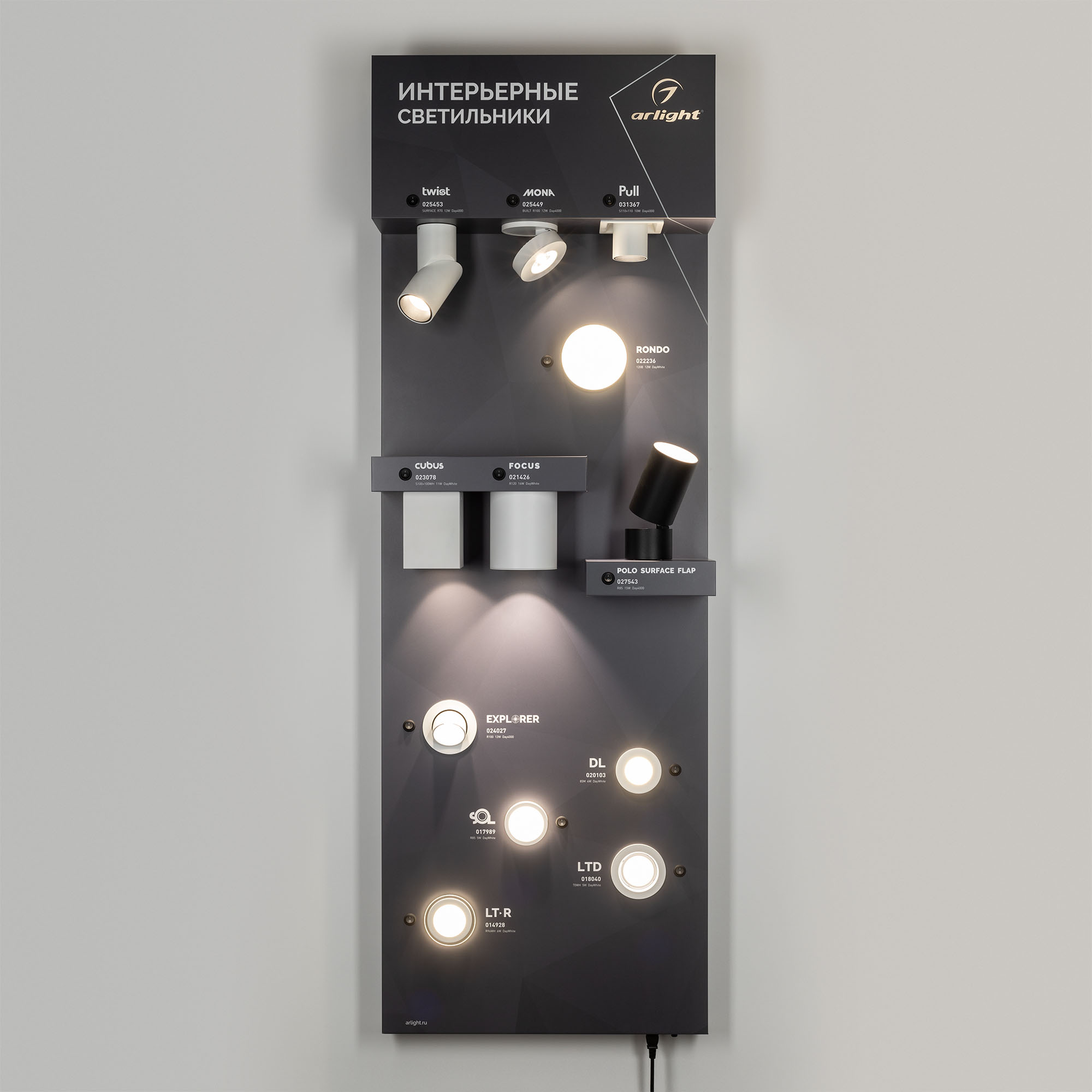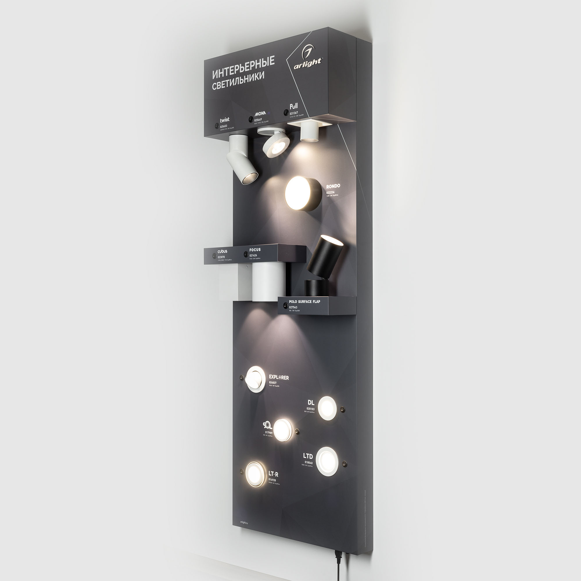 На стенде представлены интерьерные светодиодные светильники. Накладные — серии POLO, FOCUS, TWIST, CUBUS, RONDO. Встраиваемые — серии PULL, MONA, LTD, LTR, SOL, DL, EXPLORER.