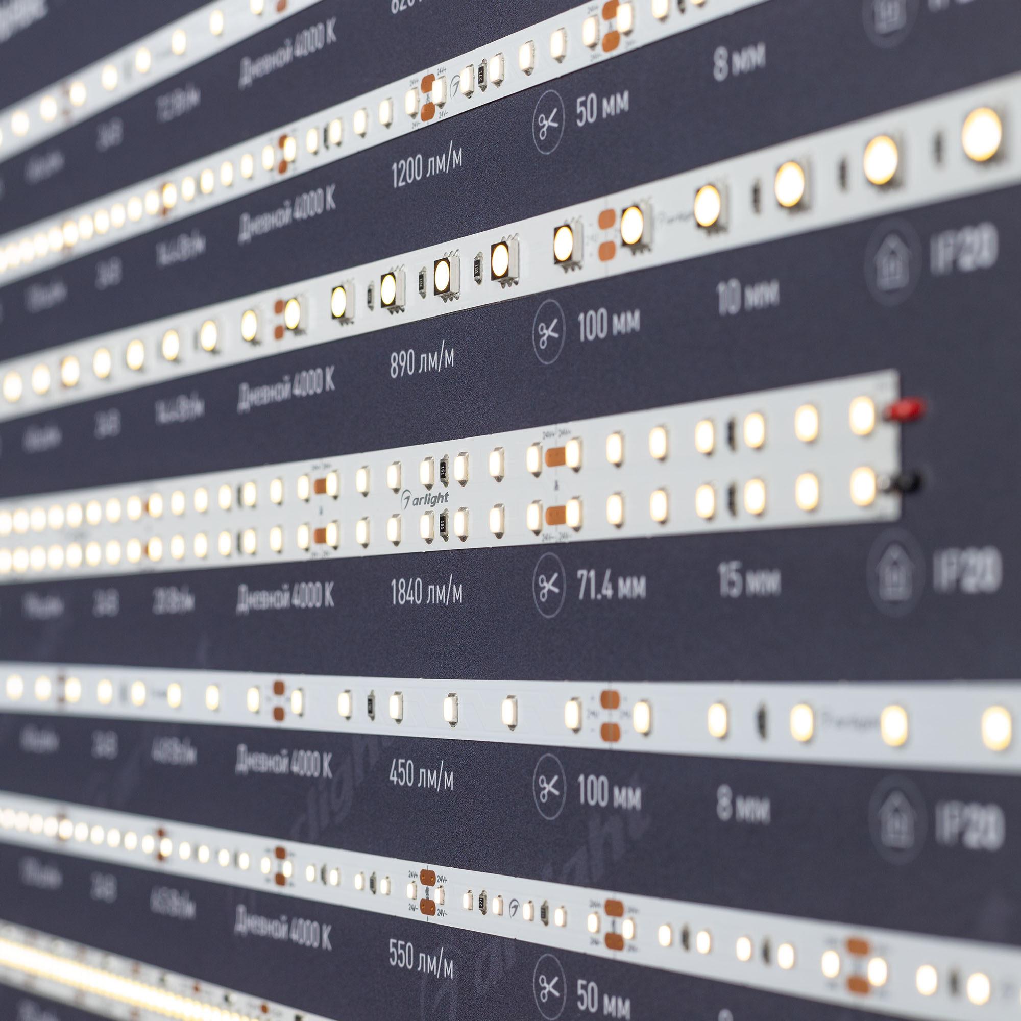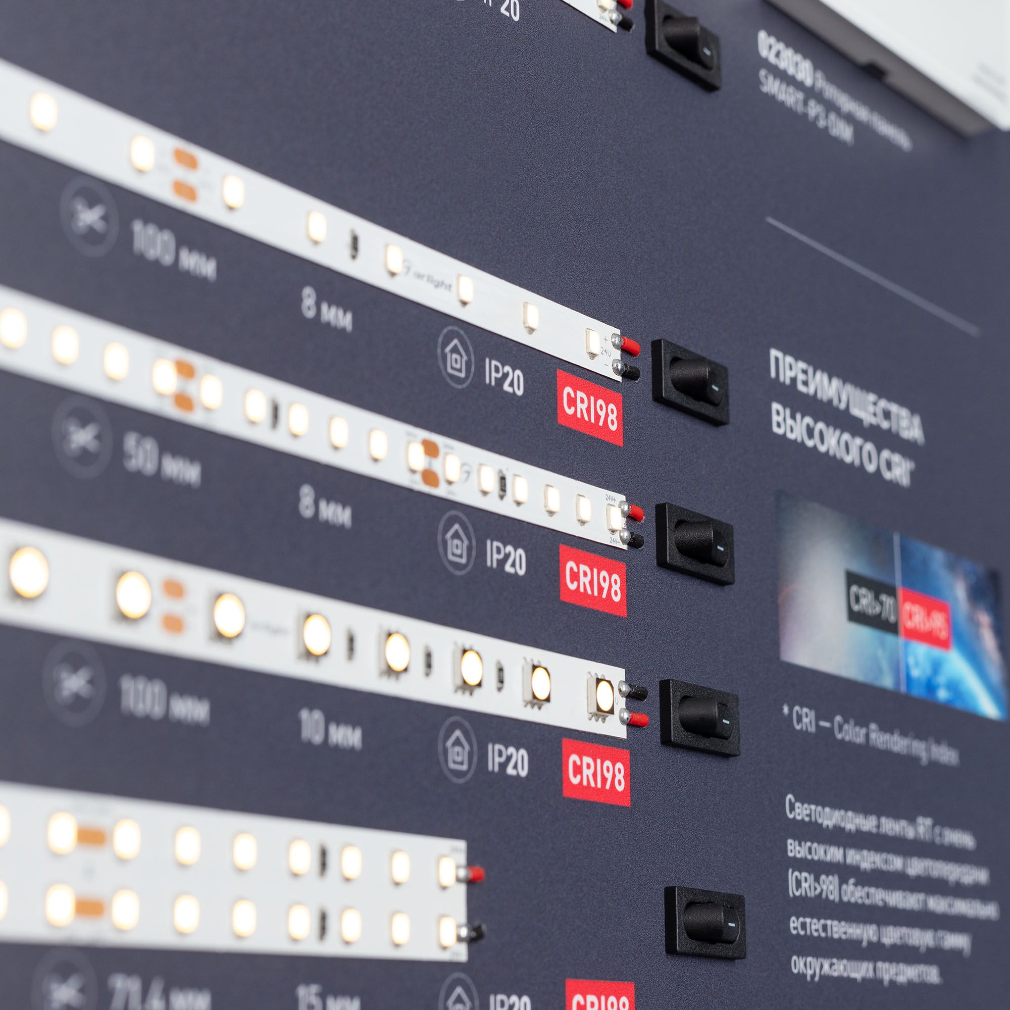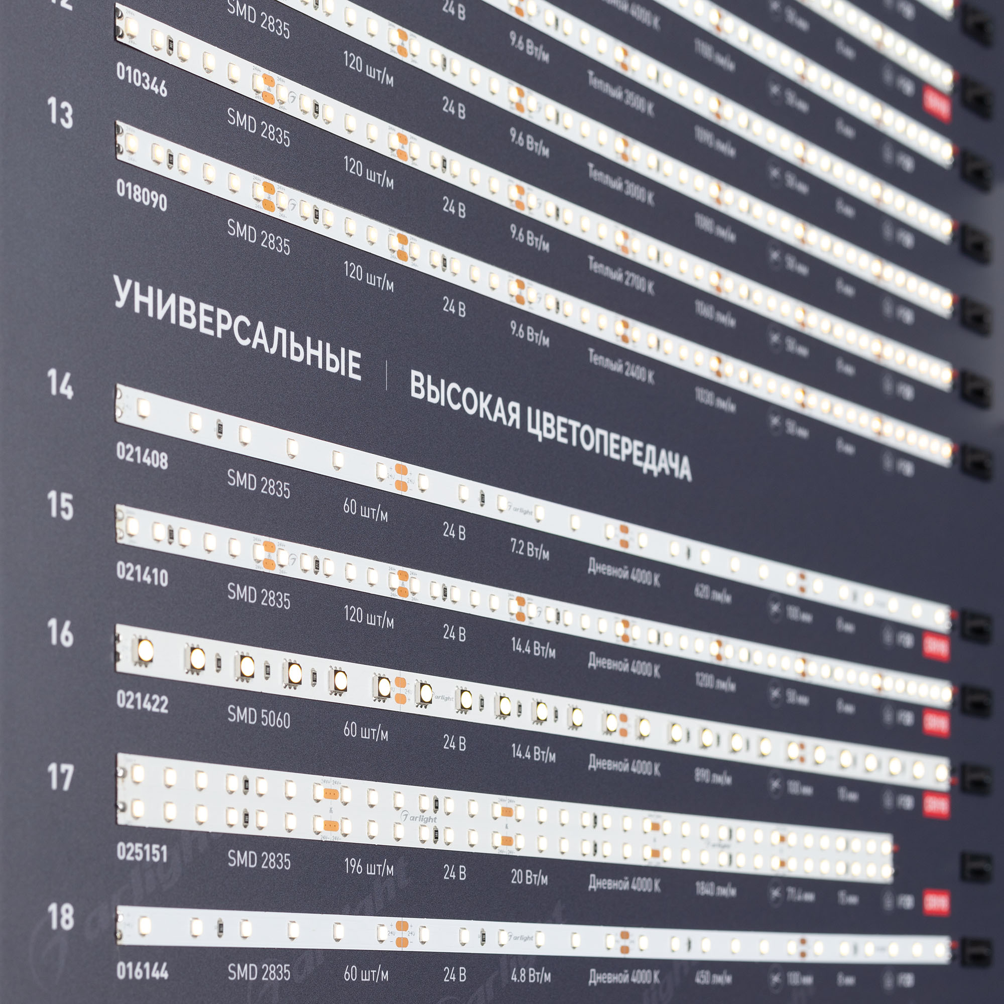 Классическая линейка светодиодных лент Arlight: с высокой цветопередачей (CRI>95… 98), универсальные, высокоэффективные (более 150 лм/Вт). Визуализирован имеющийся в ассортименте диапазон цветовых температур — 8 оттенков белого.