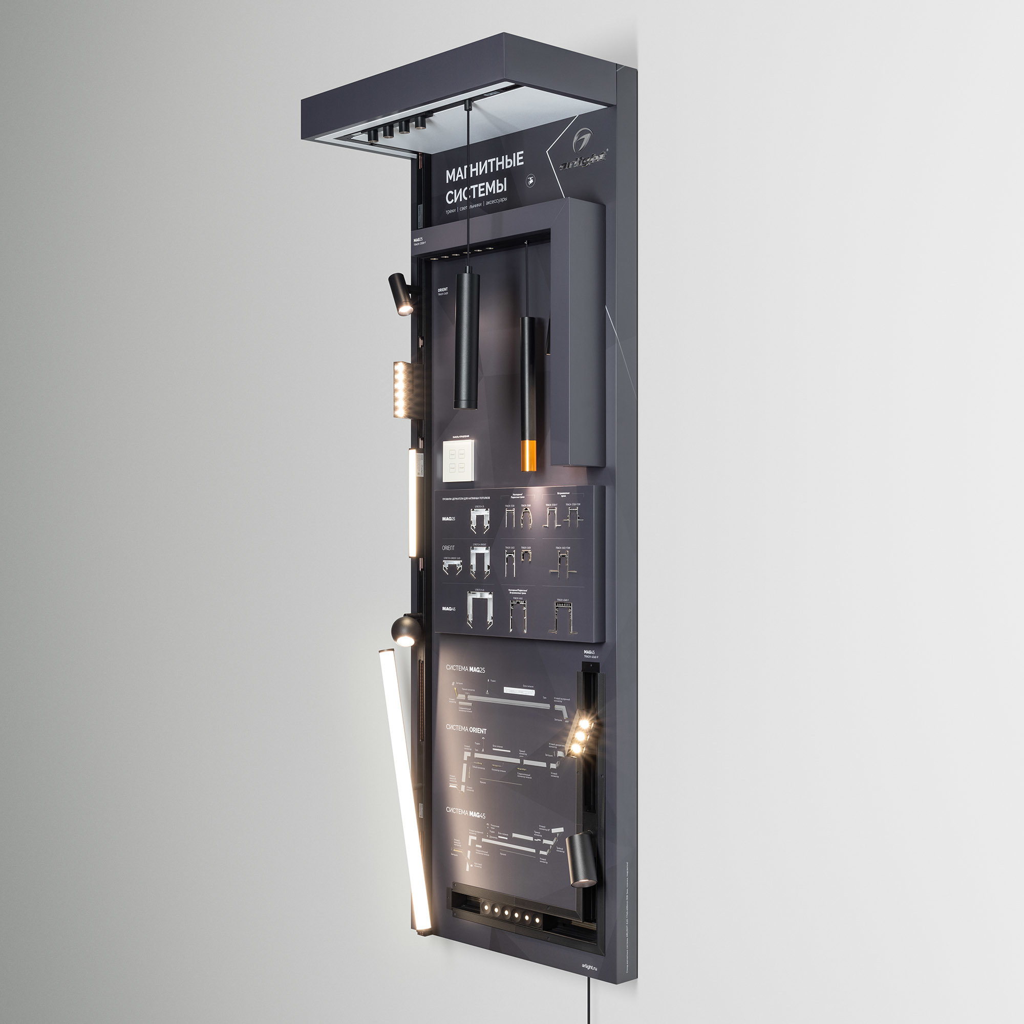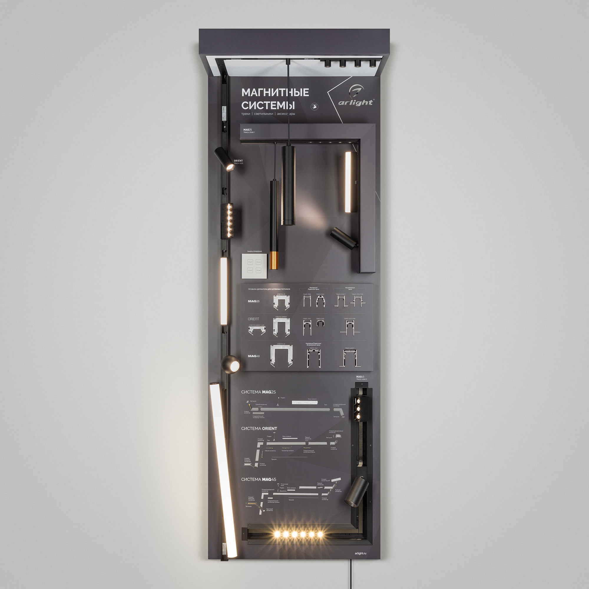 На стенде представлены магнитные системы МAG 25, MAG 45 и MAG ORIENT. Отображена полная линейка треков для данных систем: подвесные, накладные и встраиваемые модели. Показана возможность встройки магнитных систем в натяжной потолок с помощью профиля-держателя. Реализовано управление магнитной системой MAG ORIENT по протоколу DALI. Приведены схемы сборки систем с использованием дополнительных аксессуаров.