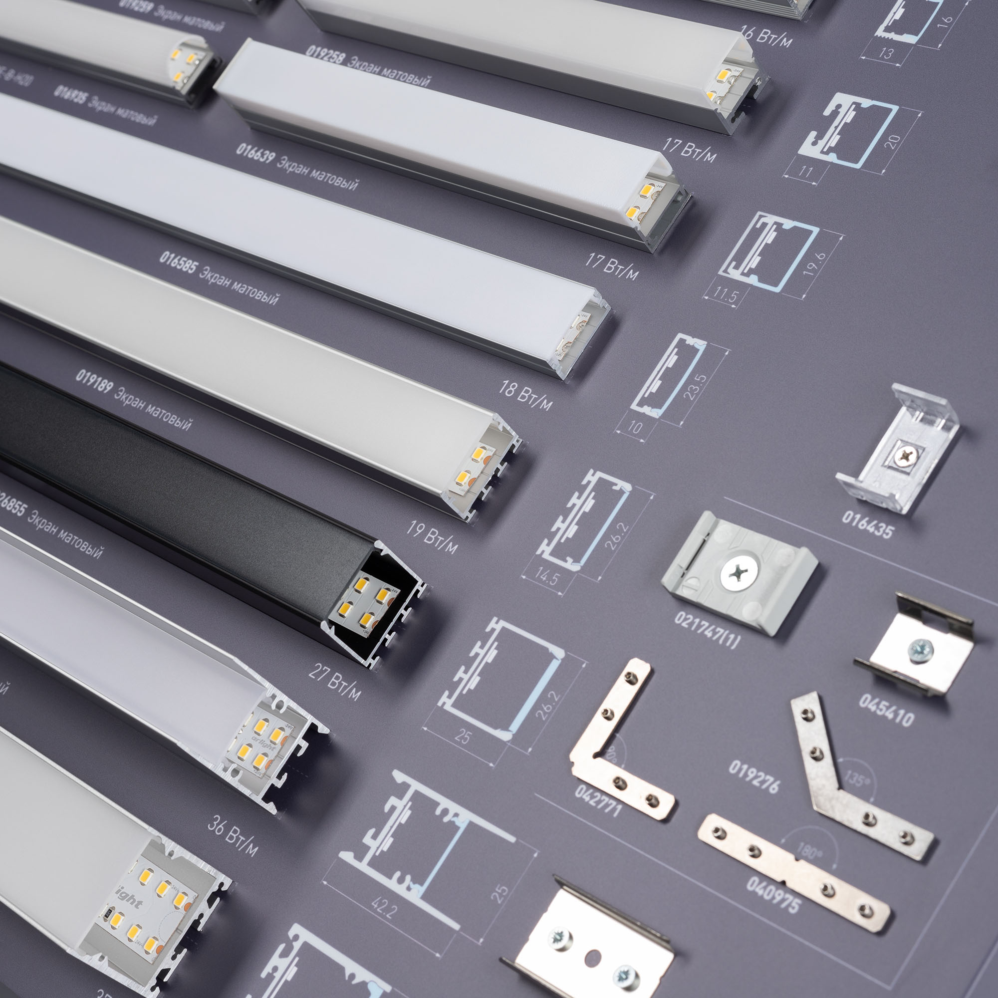 На стенде представлен ассортимент алюминиевых накладных профилей для светодиодных лент для основного и декоративного освещения.