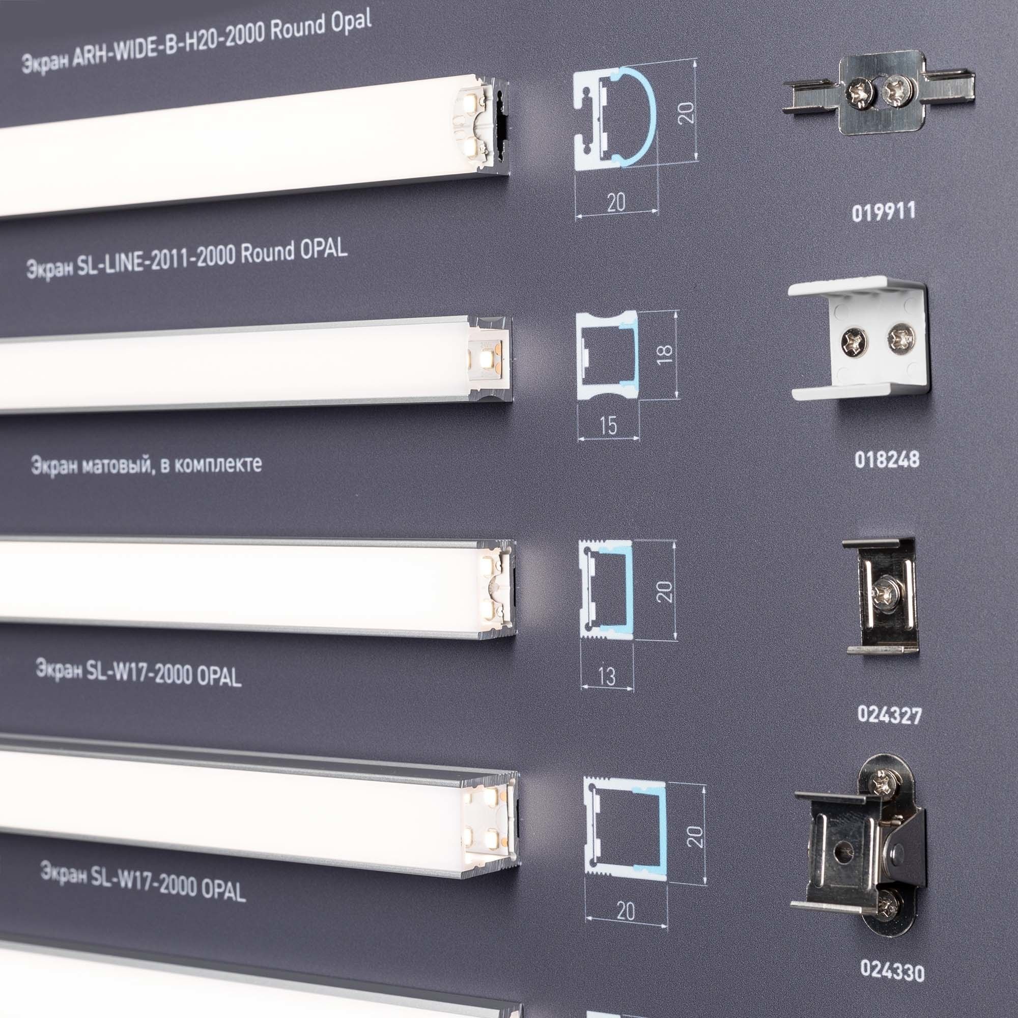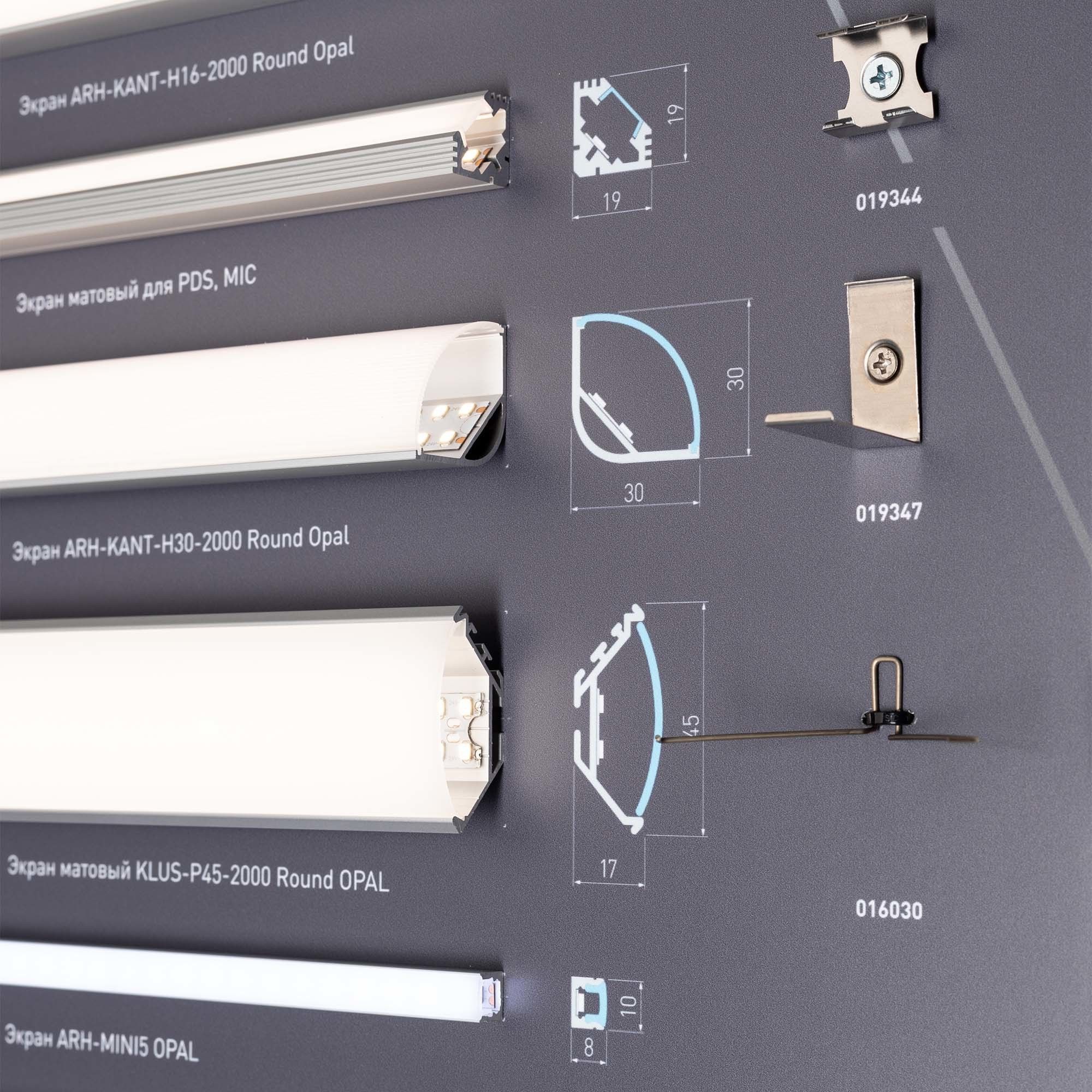 На стенде представлен ассортимент алюминиевых накладных профилей для светодиодных лент. Решения для декоративной подсветки.