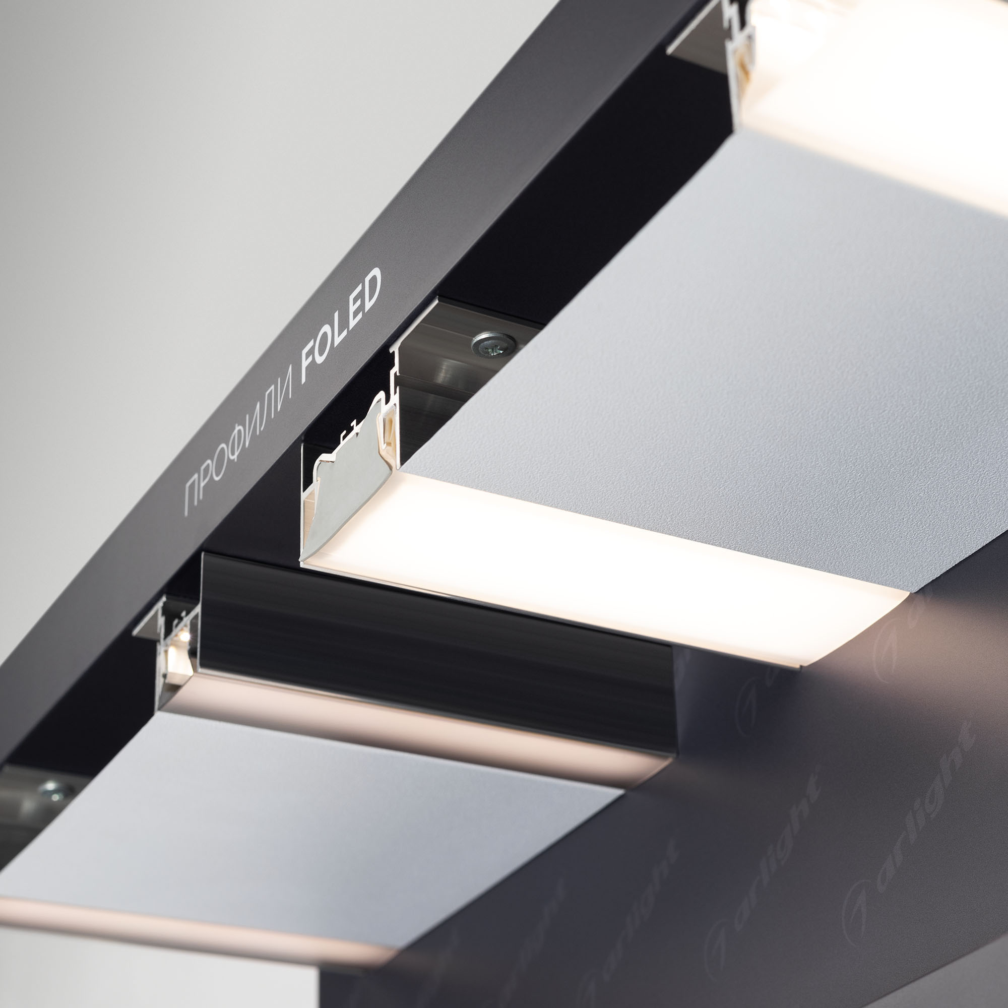 Профиль серии FOLED, совмещающий в своей конструкции каркас для крепления натяжного потолка и профиль для установки светодиодной ленты.