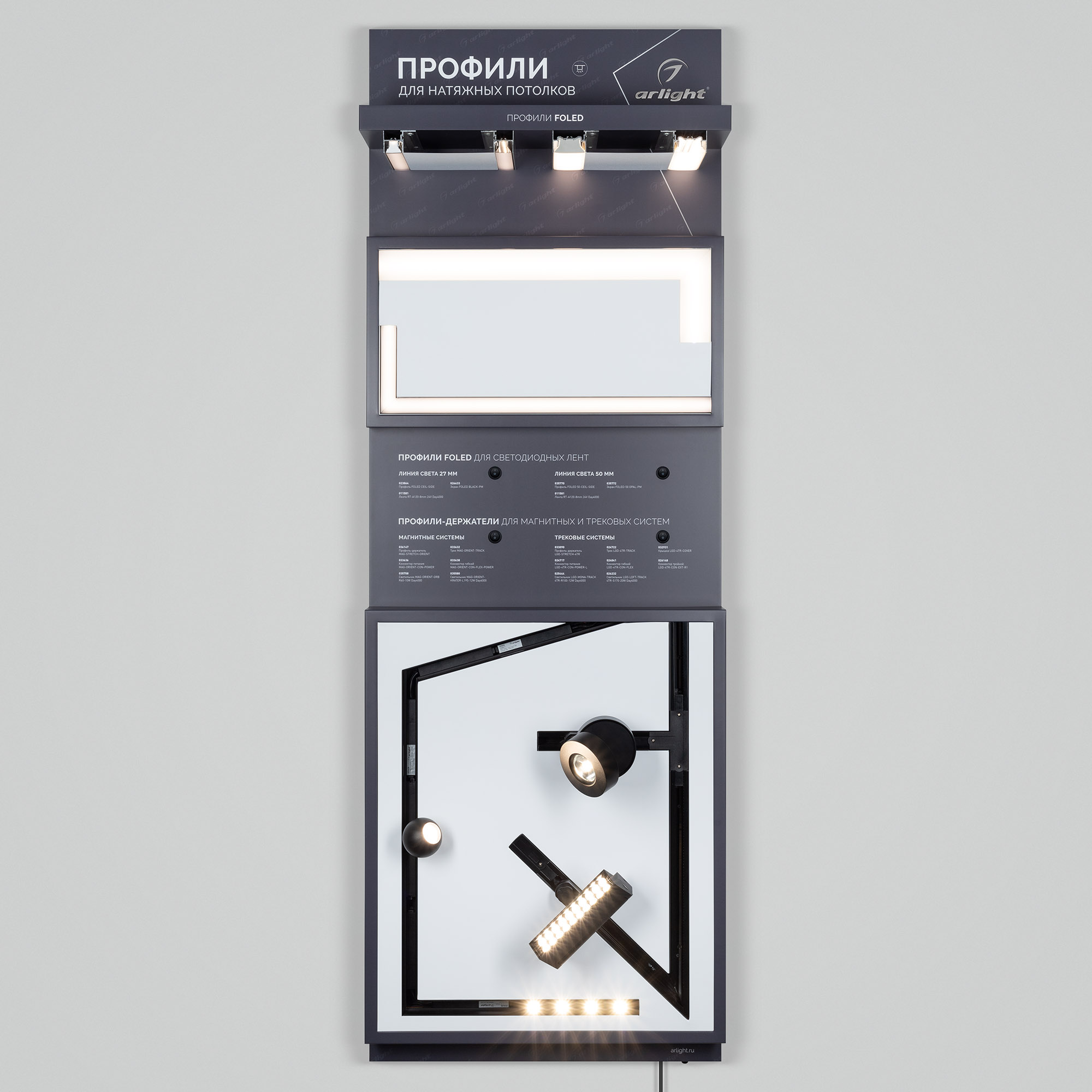 На стенде представлен ассортимент профилей Arlight для натяжных потолков: Профиль серии FOLED, совмещающий в своей конструкции каркас для крепления натяжного потолка и профиль для установки светодиодной ленты. Профиль-держатель MAG STRETCH для установки магнитных треков в натяжной потолок.
