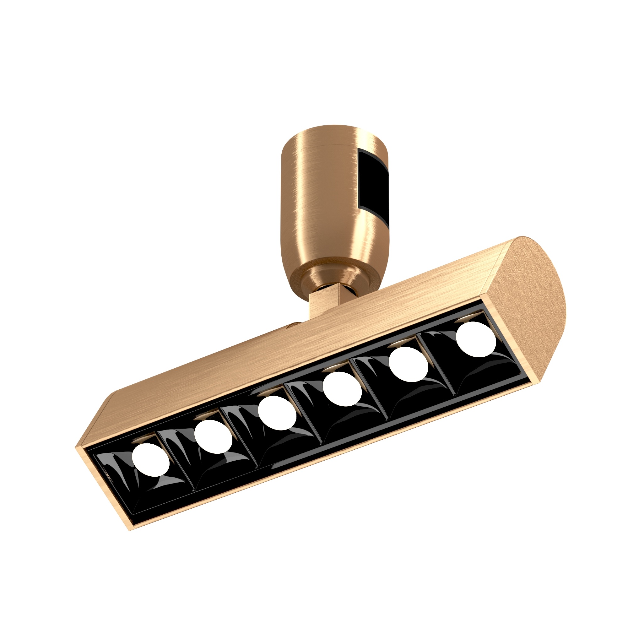 Светильник APRIORI-LASER-TURN мощностью 8 Вт для треков APRIORI шириной 17 мм. Дневной цвет свечения, световой поток 395 лм, световая эффективность 49 лм/Вт и высокий индекс цветопередачи обеспечивают качественное освещение. Прямоугольный корпус из алюминия цвета светлое золото, гармонично вписывается в различные типы интерьеров. Светильник легко монтируется на шинопровод с помощью специального механизма, поворотное исполнение позволяет направить световой поток в нужное место. Есть возможность вертикальной установки светильника. Узкий угол излучения 48 градусов подойдет для организации направленного освещения. Имеет защиту от пыли IP20 для применения внутри помещений, где нет контакта с жидкостями. Минимальный коэффициент пульсации гарантирует зрительный комфорт без мерцания. Управление яркостью осуществляется с помощью диммера по ШИМ (PWM) или возможно не адресное управление при использовании драйвера Dali, 0-10V или TRIAC. Драйвер для подключения 48В поставляется отдельно.