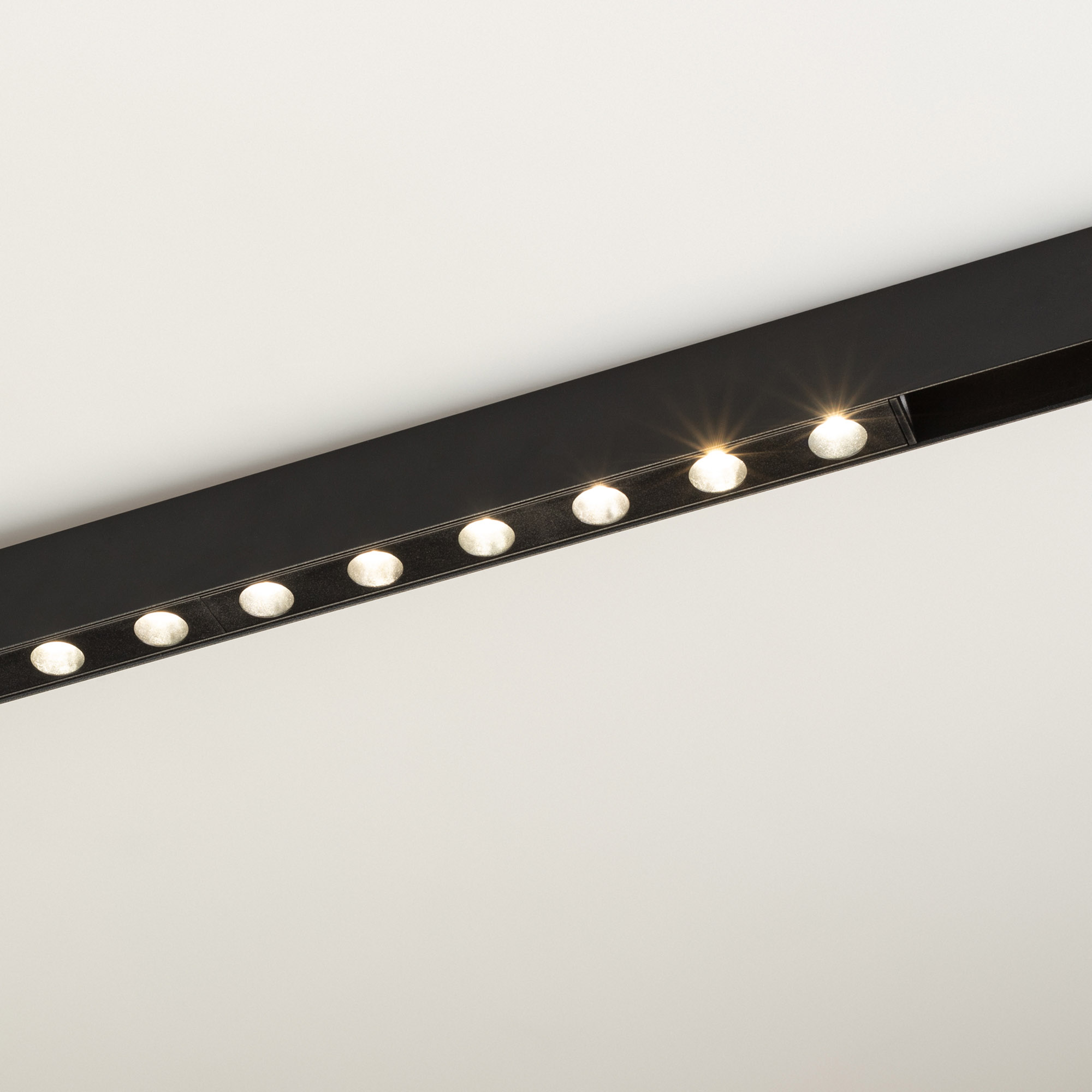 Линейный светодиодный светильник MAG-DOTS-25-L600-18W Warm3000 (BK, 30 deg, 24V, DALI) мощностью 18 Вт для магнитных треков MAG-25 с управлением DALI. Светодиоды снабжены линзами, расположены в индивидуальных ячейках и обеспечивают узкий угол и тёплый белый цвет свечения (3000 К), световой поток 1050 лм и высокий индекс цветопередачи CRI>90 гарантируют качественное освещение с точной передачей цветовых оттенков. Есть возможность управлять яркостью по протоколу DALI. У светильника безопасное напряжение 24 В и быстрая установка в шинопровод с помощью магнитов. Драйвер для подключения поставляется отдельно.