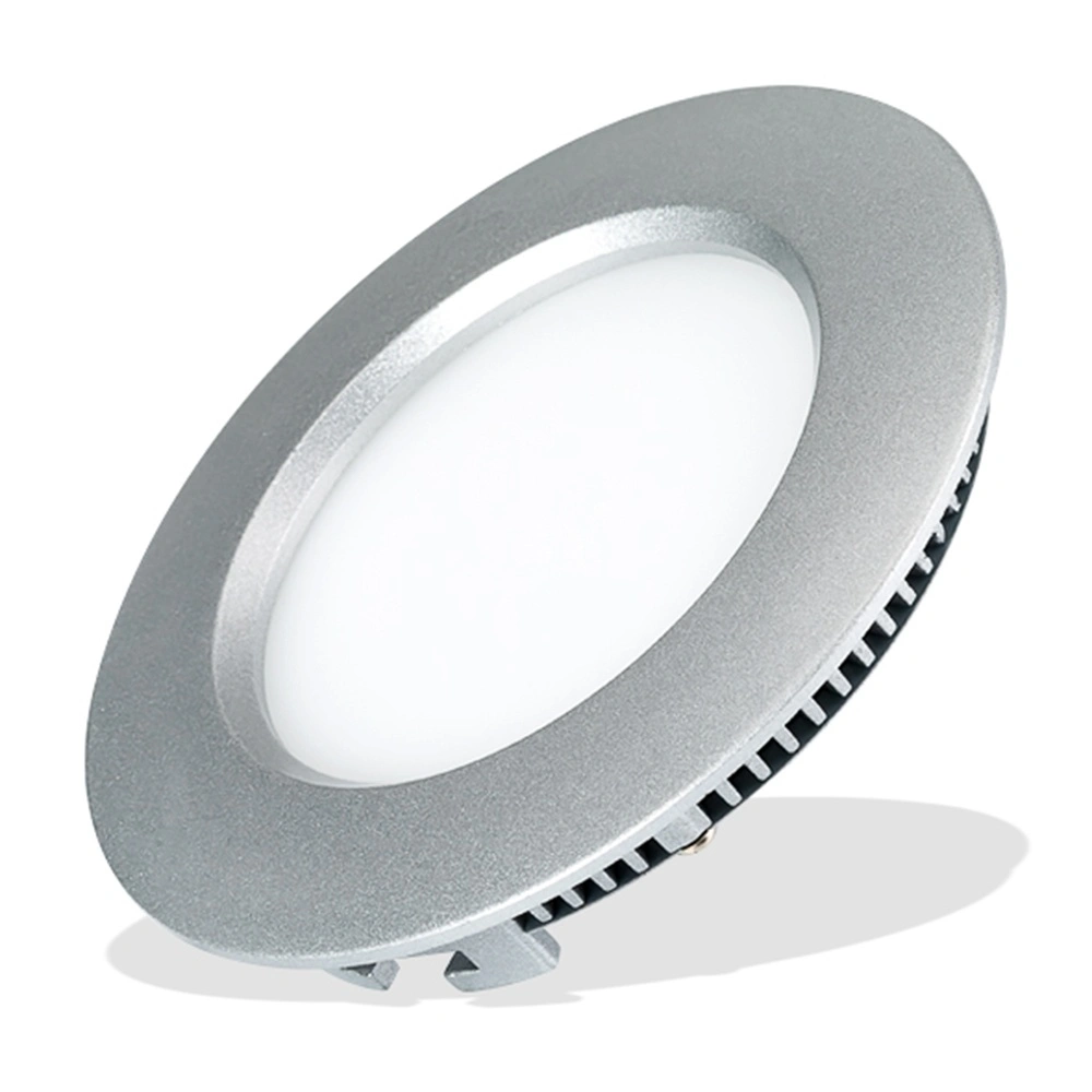 Тонкая круглая панель с эксклюзивным дизайном рамки. Цвет корпуса - серебро. Мощность 6Вт. Цвет свечения ТЕПЛЫЙ БЕЛЫЙ 3000K. Световой поток 360-450 лм. Угол 120°. Размер Ф122 x 16 мм, установка в отверстие 110 мм. Питание от сети 220VAC, драйвер в комплекте (DC260mA, 18-22V).