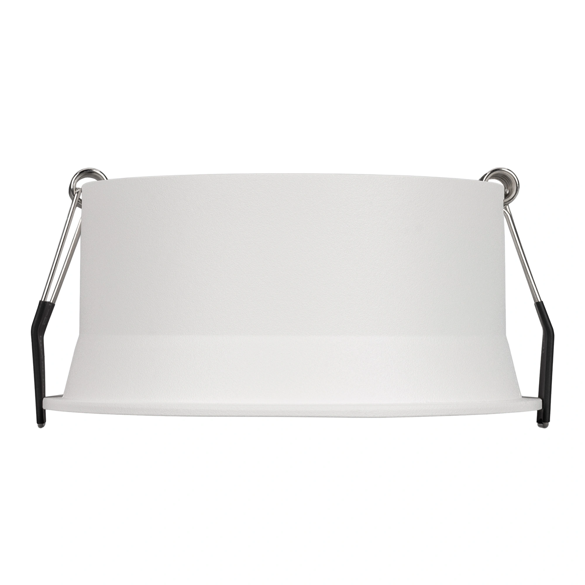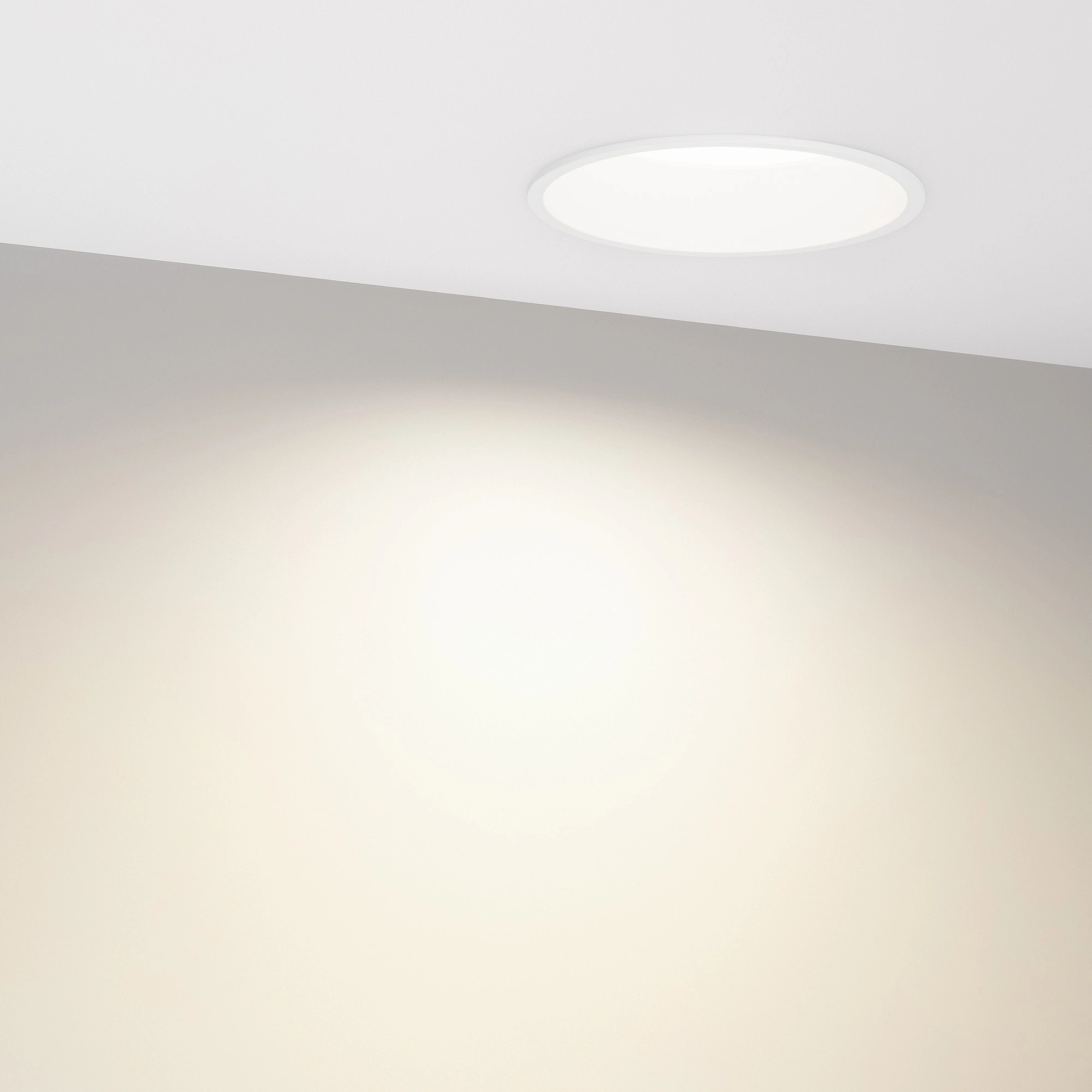 Встраиваемый круглый светильник с индексом цветопередачи CRI>90 и низкой пульсацией обеспечивает равномерное освещение без мерцания и видимости точек светодиодов с точной передачей цветовых оттенков. Алюминиевый корпус белого цвета с утопленным светодиодным модулем является интересным дизайнерским решением, создавая эффект света из ниоткуда и делая освещение комфортным для глаз. Особая конфигурация корпуса позволяет эффективно отводить тепло и продлевает срок службы светодиодов. Светильник с широким углом излучения 90 градусов и световой эффективностью 70 лм/Вт подходит для качественного основного освещения. Легко устанавливается с помощью пружин в монтажное отверстие. Драйвер поставляется в комплекте и позволяет быстро подключать светильник напрямую к сети переменного тока 230 В. Диммирование возможно при замене штатного драйвера. Степень защиты от пыли IP20 позволяет применять модель в жилых, коммерческих, торговых и других помещениях, где отсутствует контакт с водой.