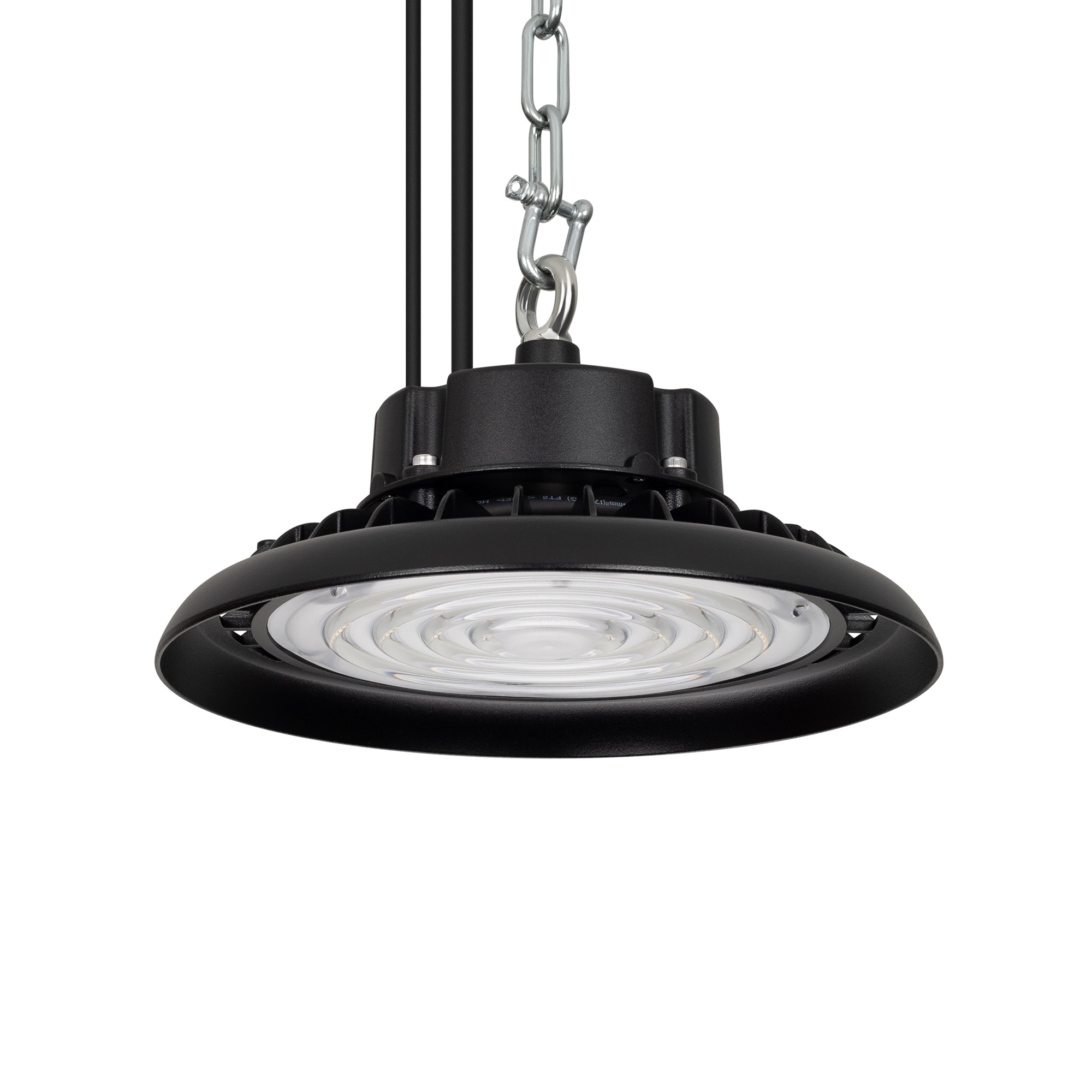 Светильник SP-ARIVA-DIM мощностью 100 Вт, дневного цвета свечения 5000K, световым потоком 15000 лм и углом рассеивания 60 градусов предназначен для освещения складских и промышленных помещений. Черный цвет корпуса, габариты Ф260xH140 мм., степень пылевлагозащиты IP65., индекс цветопередачи CRI 80, степень ударопрочности IK08. Доступно управление по протоколу 0-10В. Рым-болт в комплекте.