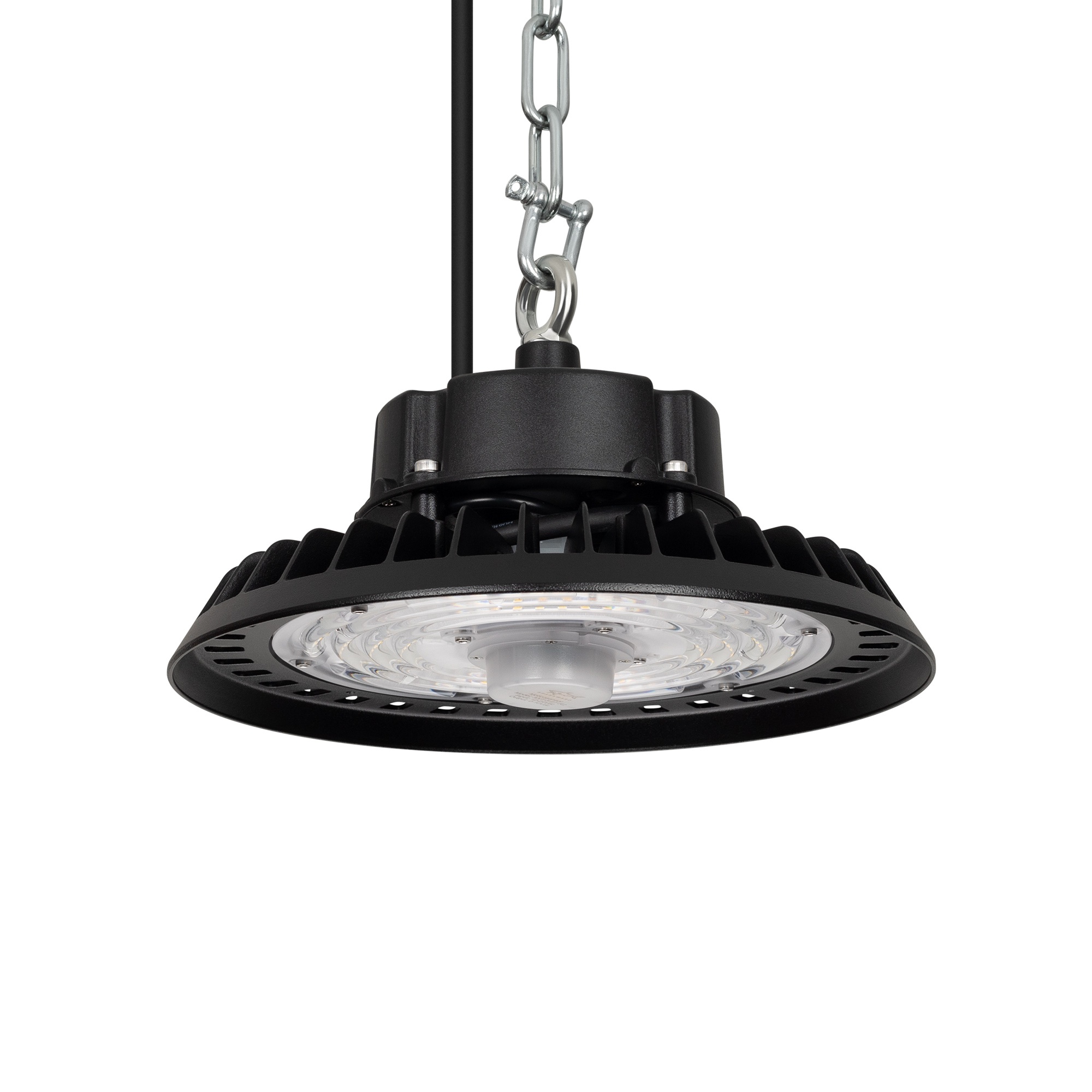 Светильник SP-ARIVA-MOTION мощностью 100 Вт, дневного цвета свечения 5000K, световым потоком 15000 лм и углом рассеивания 60 градусов предназначен для освещения складских и промышленных помещений. Черный цвет корпуса, габариты Ф260xH140 мм, степень пылевлагозащиты IP65., индекс цветопередачи CRI 80, степень ударопрочности IK08. Рым-болт в комплекте. Датчик настраивается с помощью пульта 052018 (один на все датчики). Доступно управление по протоколу 0-10В.